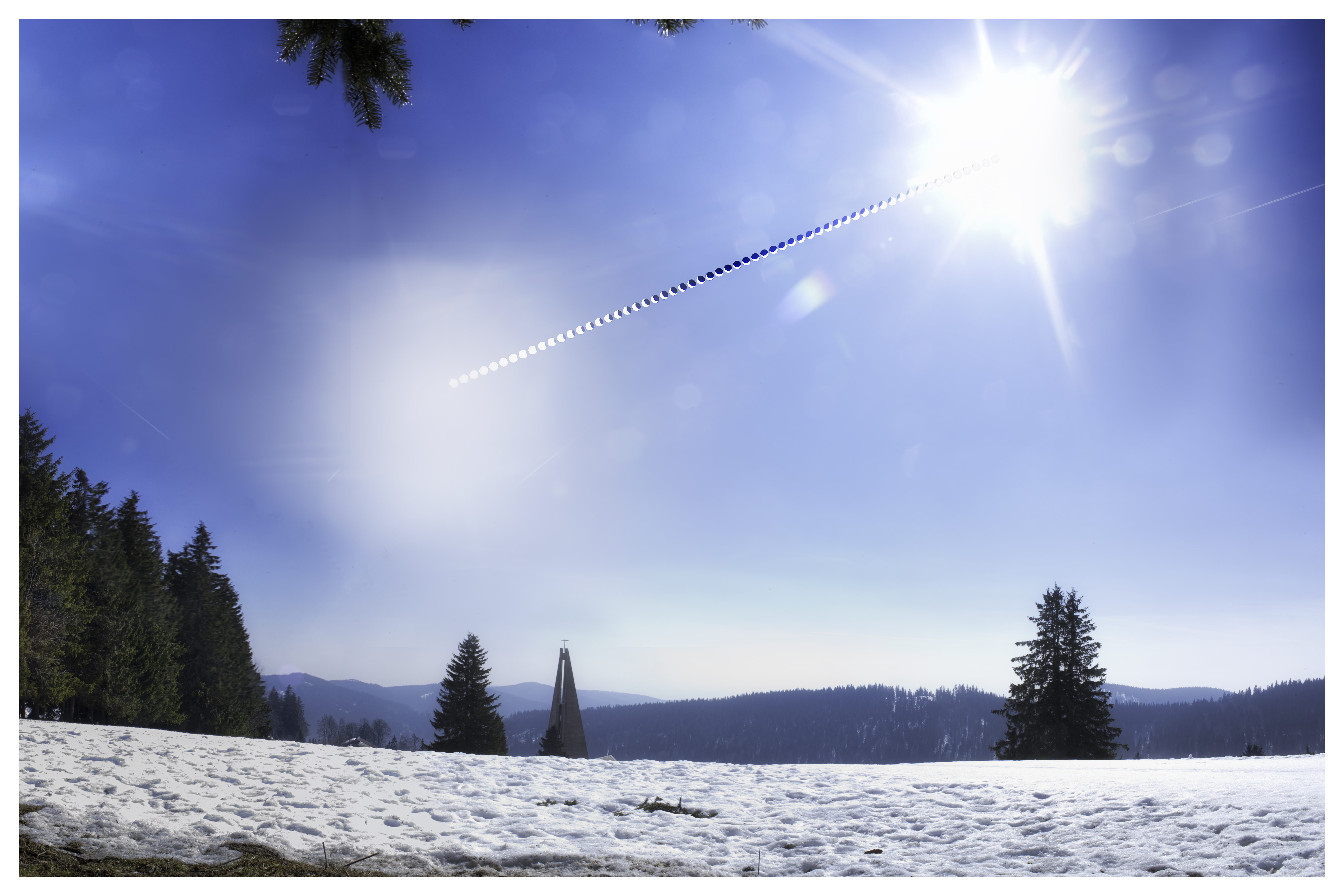 Das Wetter meinte es gut mit uns. Mit einem 35-Millimeter-Objektiv hatte ich getestet, dass der Verlauf der SoFi auf eine feste Einstellung des Stativs passen würde. Ein Panorama fertigte ich vor und nach der SoFi an und überlagerte die Finsternisreihe mit der Baader-Sonnenfolie.