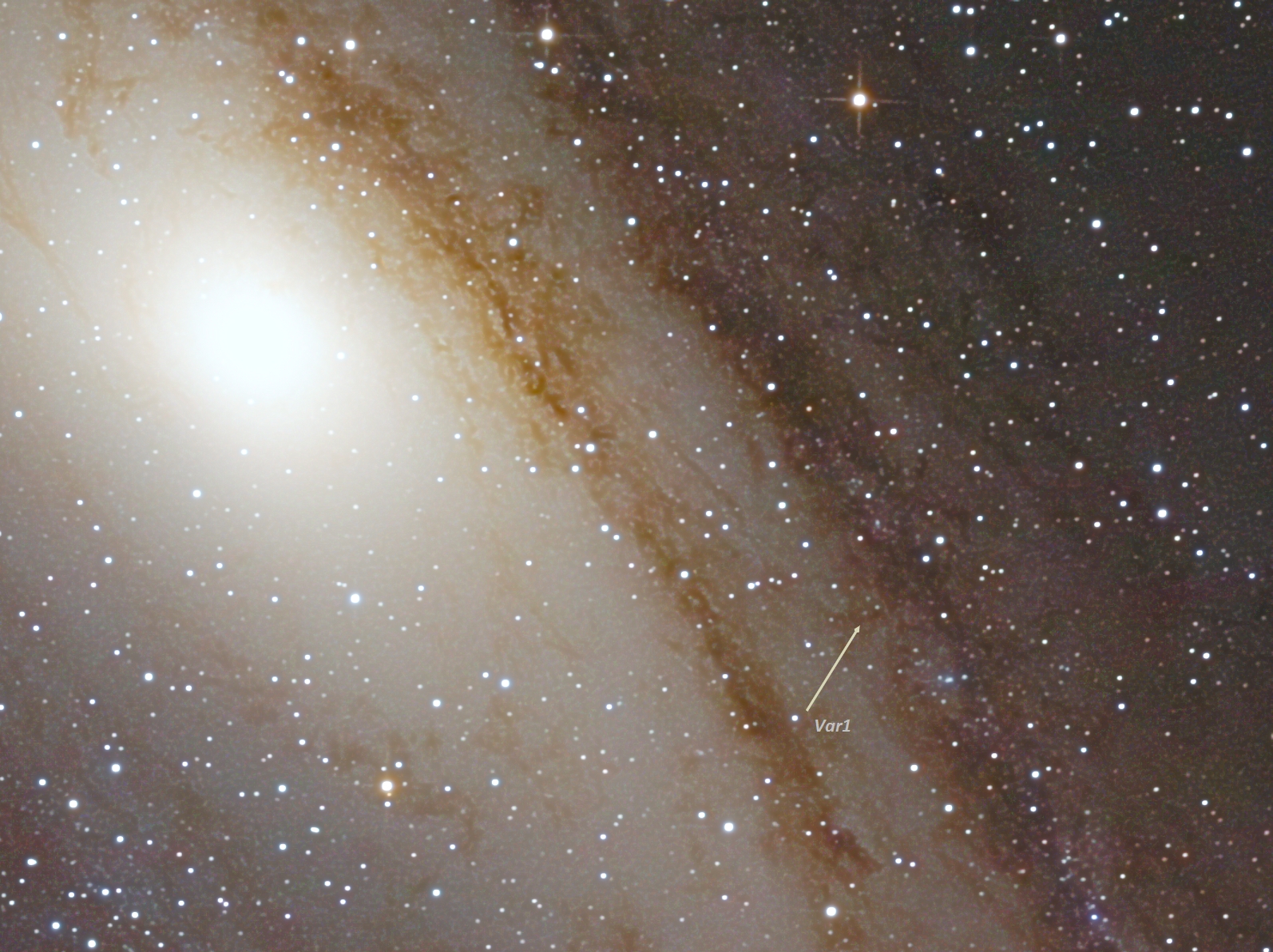 Hier ist eine Ausschnittsvergrößerung, kontrastverstärkt, des First-Light-Bildes mit Hubbles Var. No. 1.