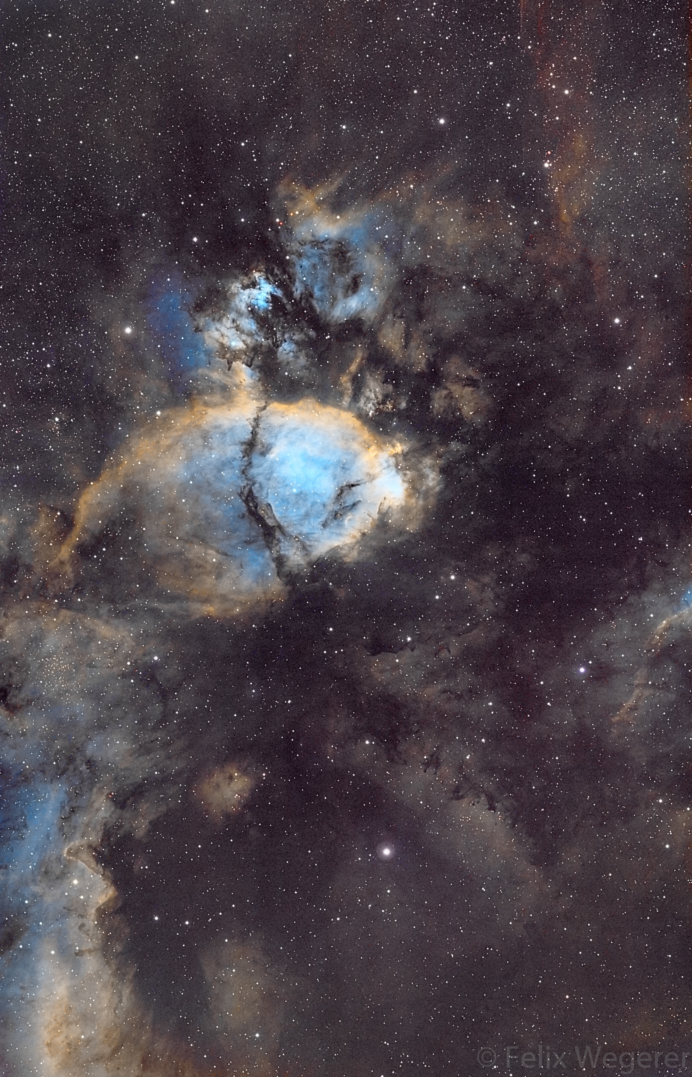 Der Fischkopfnebel geht oft neben seinem Nachbarn dem Herznebel unter, doch die Strukturen sind nicht weniger spannend. Mit der Hubble Palette lassen sich die drei Gase Wasserstoff, Sauerstoff und Schwefel schön darstellen. So sind zu Beispiel die blauen Sauerstoff Strukturen im inneren des Fischkopfs äußerst schön anzuschauen.