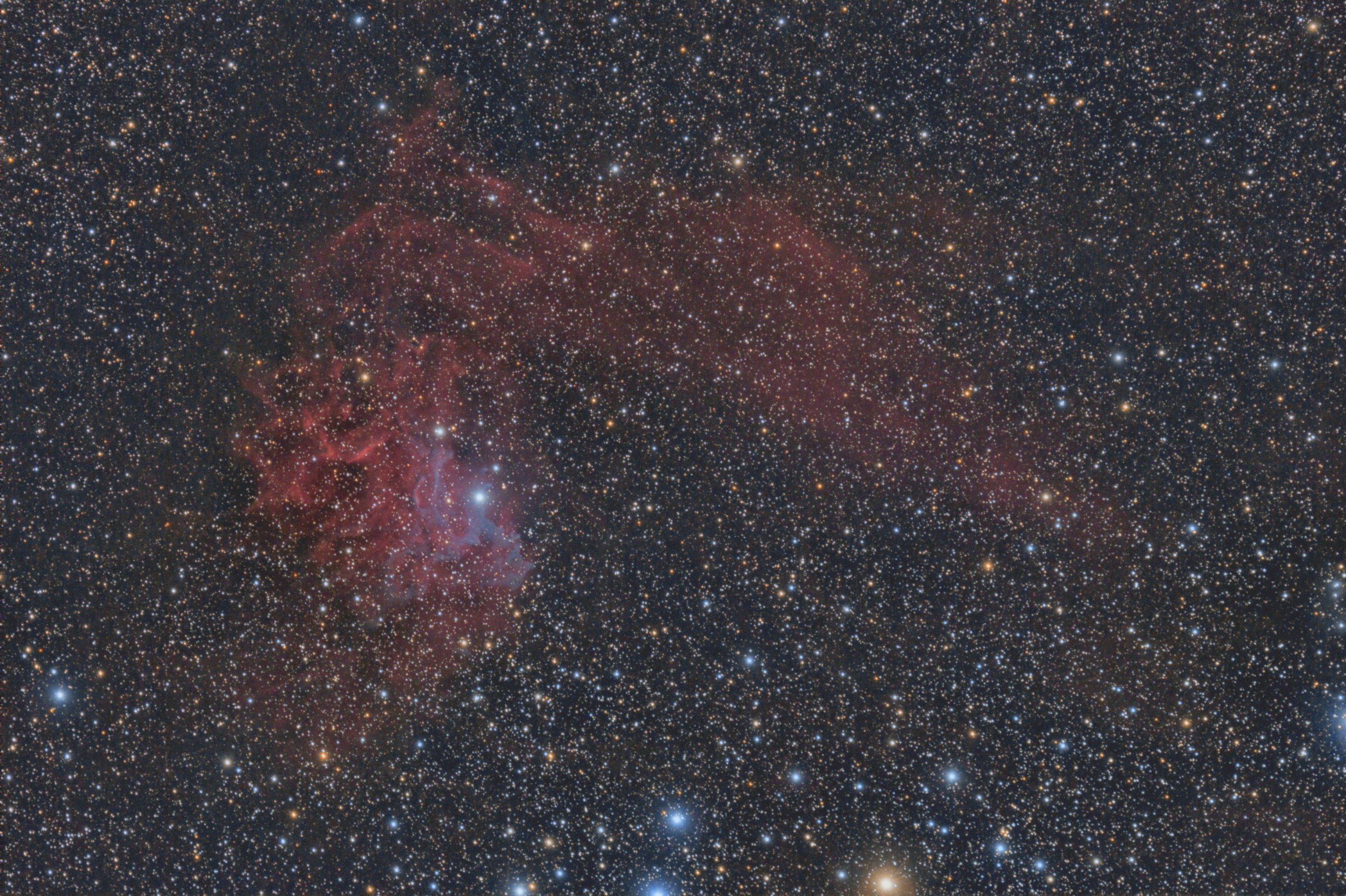 im November 2016 konnte ich bei sehr guten Bedingungen die Gegend um IC 405 als Widefield fotografieren. Der Emissionsnebel im Sternbild Fuhrmann wird auch als "Flaming Star Nebel" bezeichnet und ist rund 1500 Lichtjahre von der Erde entfernt. Ich habe 44-mal 600s bei ISO 800 belichtet. Kalibriert mit 100 Bias, 30 Darks und 30 Flats. EOS400Da am ED80 von Skywatcher auf NEQ6. Insgesamt sind das 7:20 h Belichtungszeit