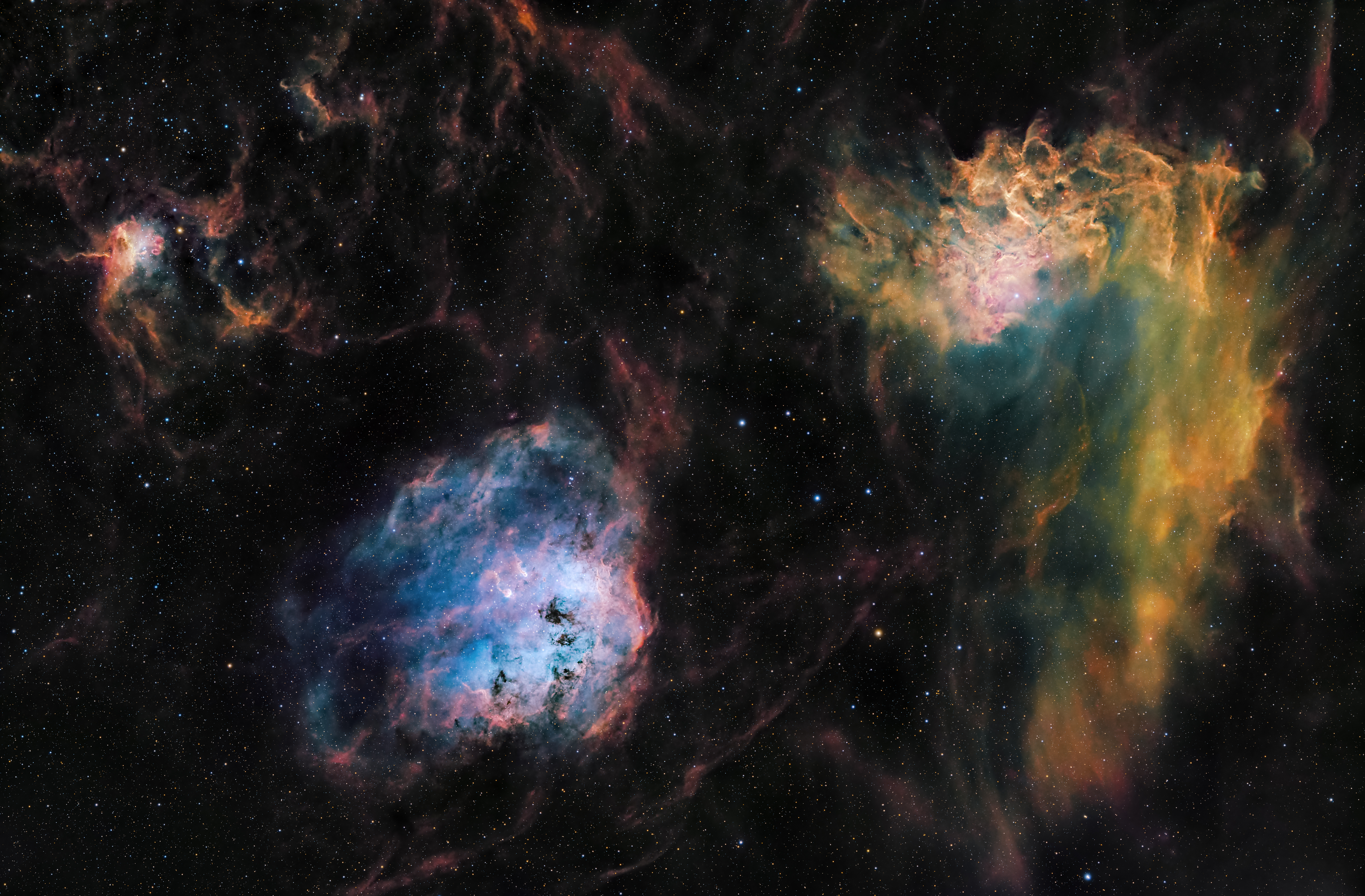 | Belichtungszeit | dec 2024 Optolong L-Ultimate (Ha-O3) 3nm: 118X600” Altair Dual Band (SII-O3) 6 nm: 54X600” UvIr cut (colore stelle): 80X30” Tot: 29h 20’ |
