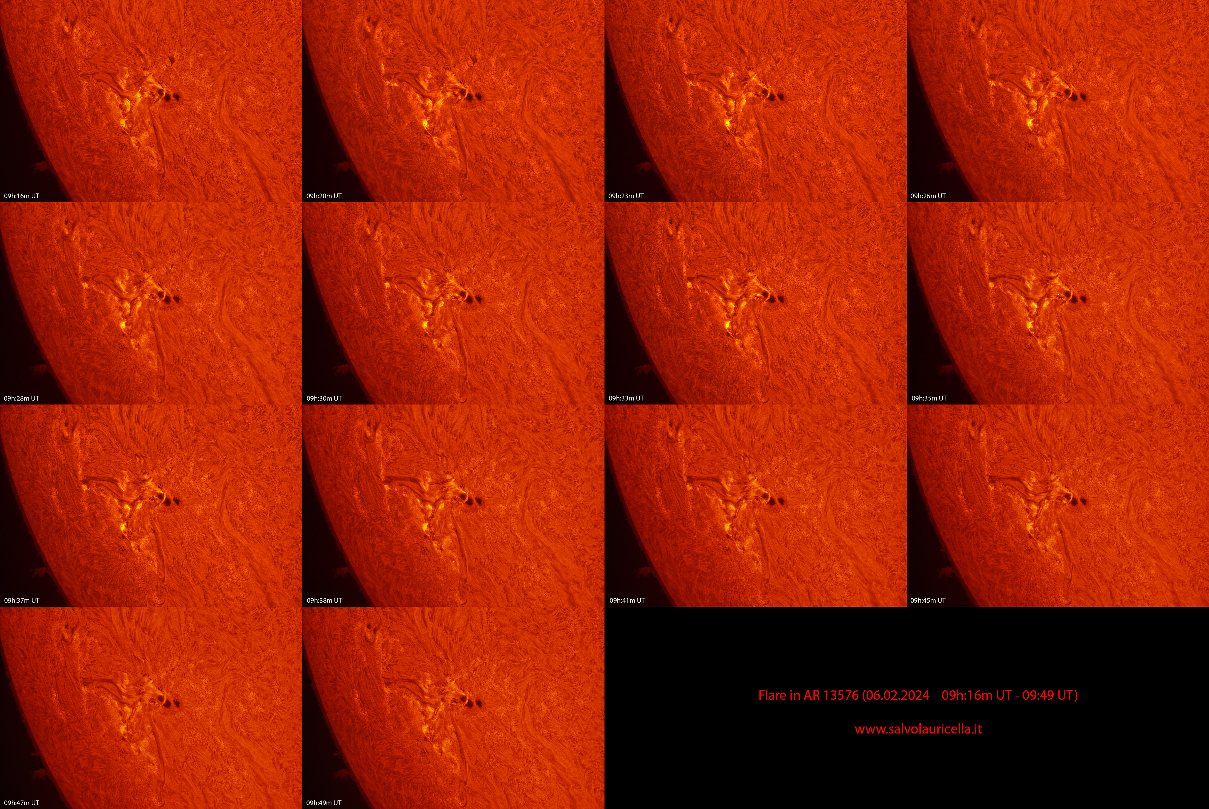 Flare in active region 13576 taken from Syracuse, Italy, on 6 February 2024 from 09:16 to 09:49 UT. It is possible to view a short animation of the event at the following link: https://www.salvolauricella.it/sole/animazioni-solari/#ar13576-20240206-animazione-gif