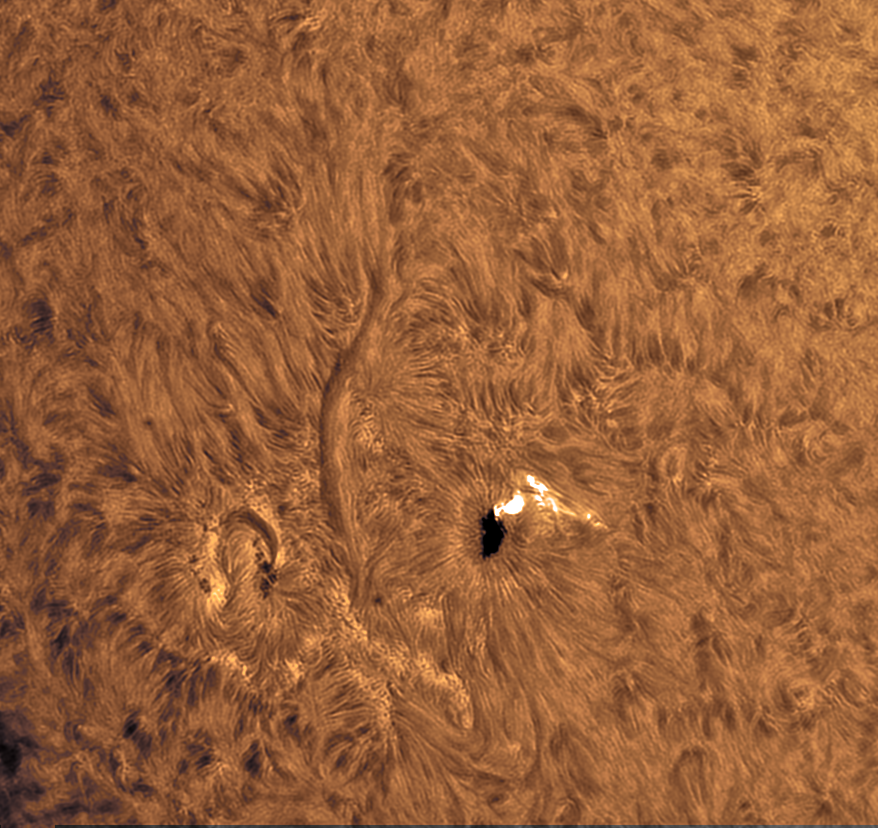 Am Ende der Beobachtung fiel mir auf, dass gerade in der Penumbra des Sonnenflecks in der aktiven Region ein kleiner Flare aufgetaucht war, den ich die nächste halbe Stunde verfolgen konnte, bis er sich wieder der Umgebung vor dem Flare anglich.