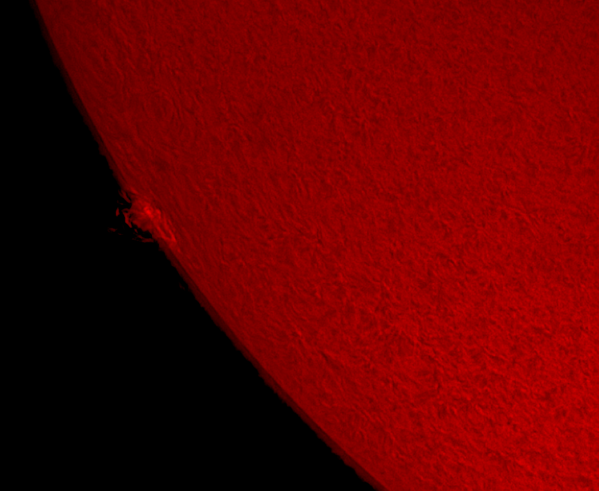 Am Rand der ansonsten unspektakulären Sonnenscheibe tauchte heute Vormittag ein kleines Flaregebiet auf. Es ist ein bisschen "hochgekocht", eine Animation war aber wegen der wenigen und länger auseinander liegenden Fast-Wolkenlücken nicht drin, da kein flüssiger Ablauf zustande gekommen wäre.