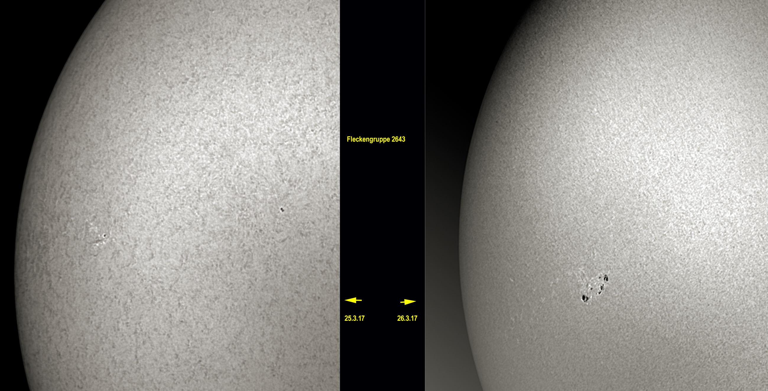 Entwicklung der Fleckengruppe innerhalb eines Tages vom 25. zum 26. März 2017.