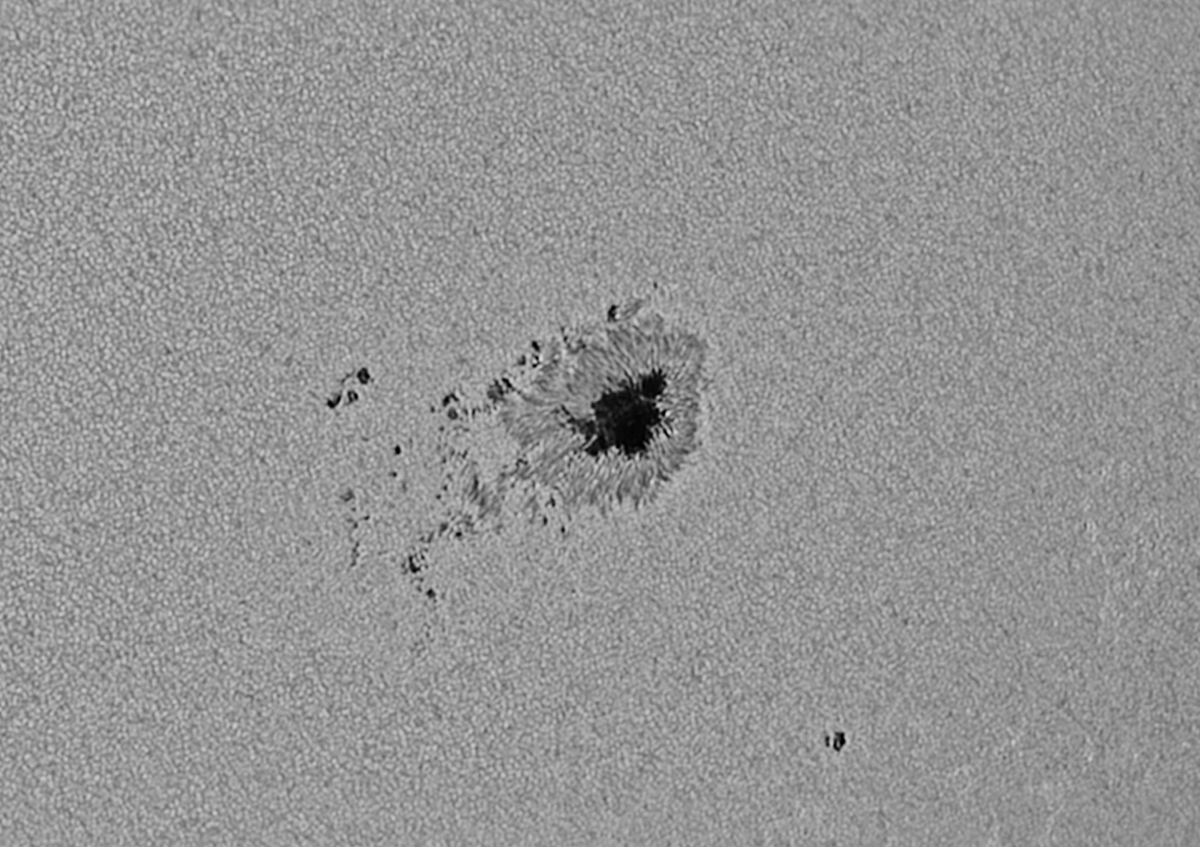 Die markante Fleckengruppe um AR 2835 im Detail. AVI mit 20000 Bildern mit jeweils 0,032 ms belichtet, davon die besten 380 Bilder gestackt. Filter: Baader Cool Ceramic Herschelkeil.