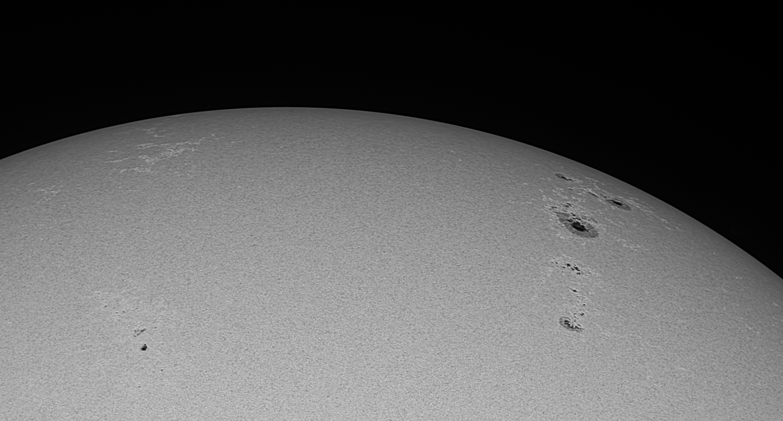 Neue Sonnenflecken zeigen sich am Ostrand der Sonne. Dank der Nähe zum Sonnenrand sich die umliegenden Fackelgebiete sehr schön zu sehen. Insgesamt sind drei Gruppen im Bildausschnitt.