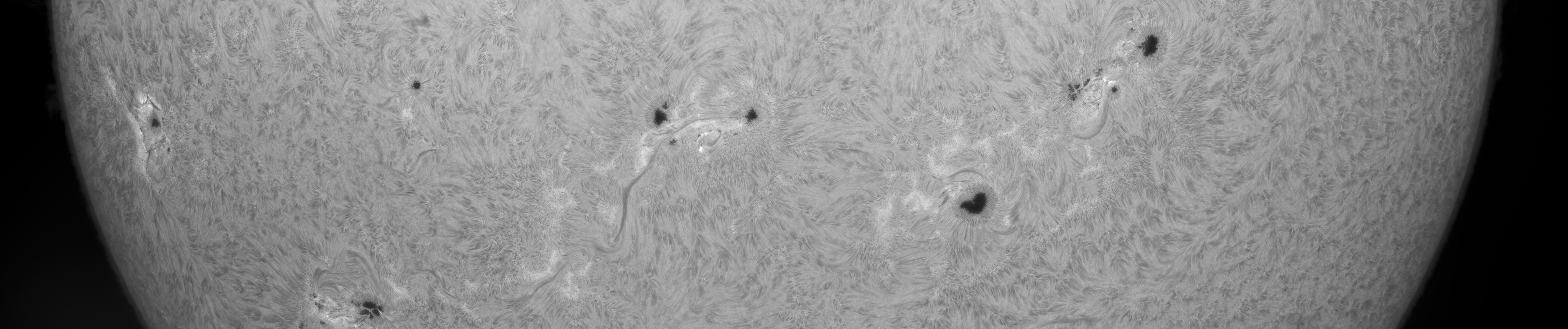 Zahlreiche große Fleckengruppen, die noch dazu in einem Band am heutigen 23. August 2024 auf der Sonne im Licht der Wasserstoffemissionslinie zu sehen waren.