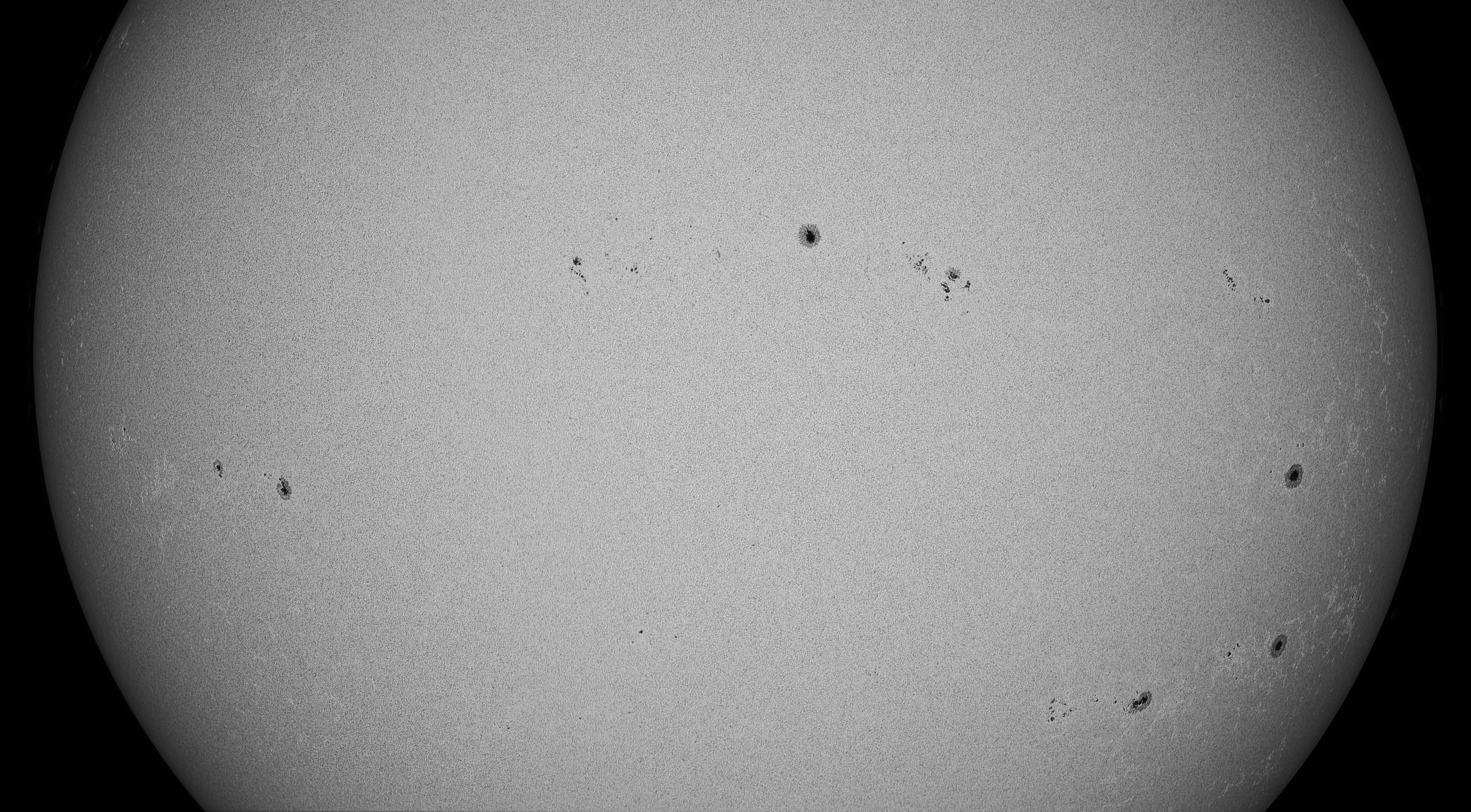 Unter besten Verhältnissen zeigte sich die Sonne am klaren Himmel. So kann auch eine relativ bescheidene Ausrüstung schöne Bilder hervorbringen. Eingesetzt wurde ein Sky-Watcher 100 x 900 mm mit Herschelkeil und Continuumfilter 7.5 nm. Aus 2000 Aufnahmen habe ich lediglich die besten 8 Bilder weiterverarbeitet. Das Bild ist ein Mosaik aus zwei Aufnahmen, da die ganze Sonne auf dem Sensor der ASI 178MM Kamera nicht Platz findet. Aus diesem Grunde sind auch die polaren Gebiete mit wenig Aktivität nicht auf dem Bild zu sehen.