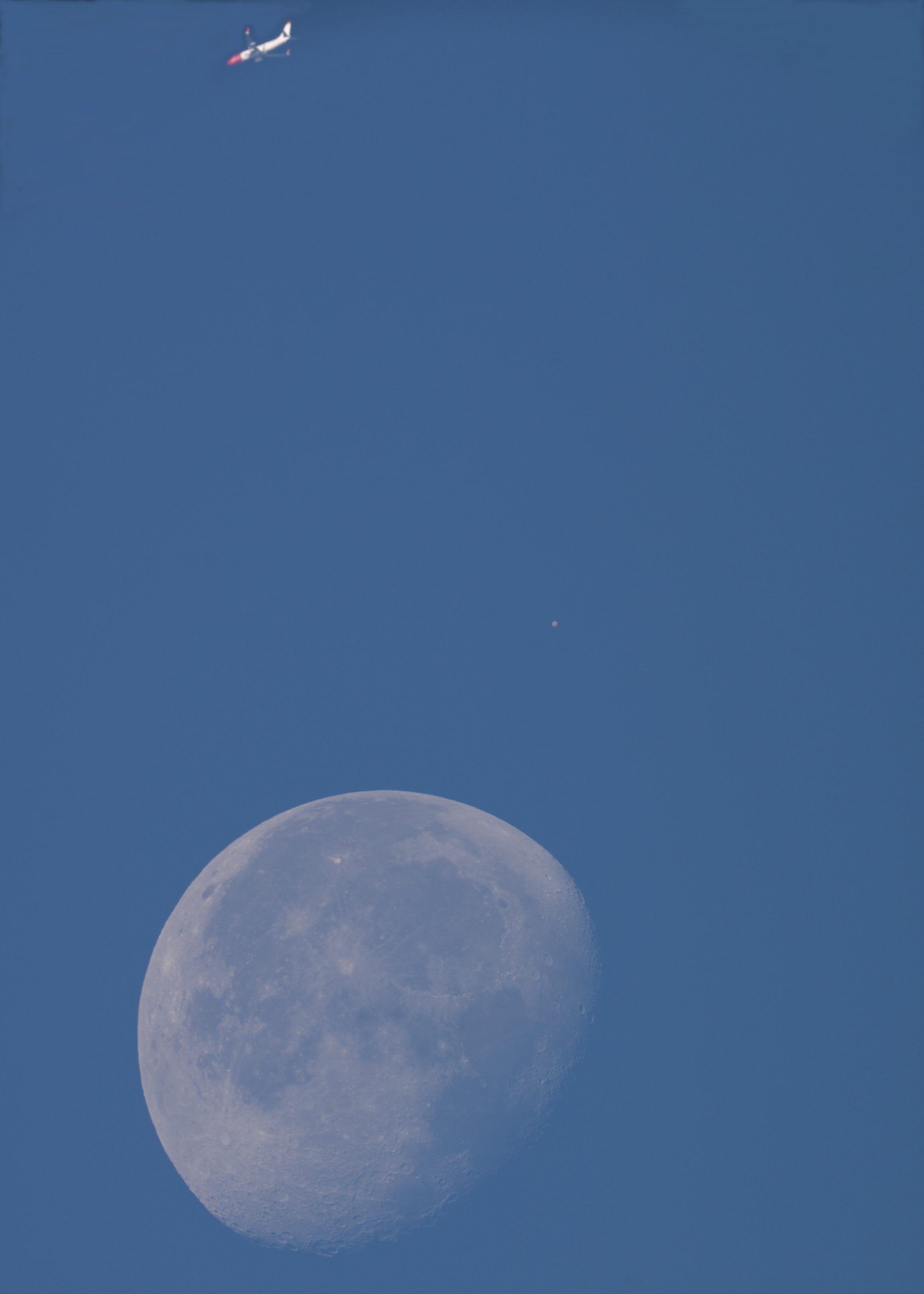 Am Morgen des 6. September 2020 kurz vor der engsten Begegnung für Meißen schaffte es auch noch ein Flieger ins Bild. Aufnahme am 130/1200 APO mit SONY alpha 7S