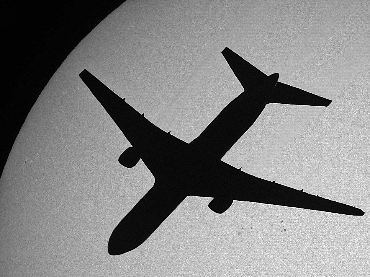 Flugzeug vor der Sonnenscheibe. Unten rechts im Bild die Fleckengruppe AR 13357. Am Westrand eine weitere Gruppe mit Fackelgebiet.