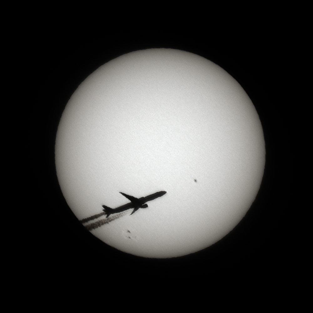 Leserbilder Astronomie: Flugzeug vor der Sonne mit den Sonnenflecken AR 2886 und 2887 am 24. Oktober 2021