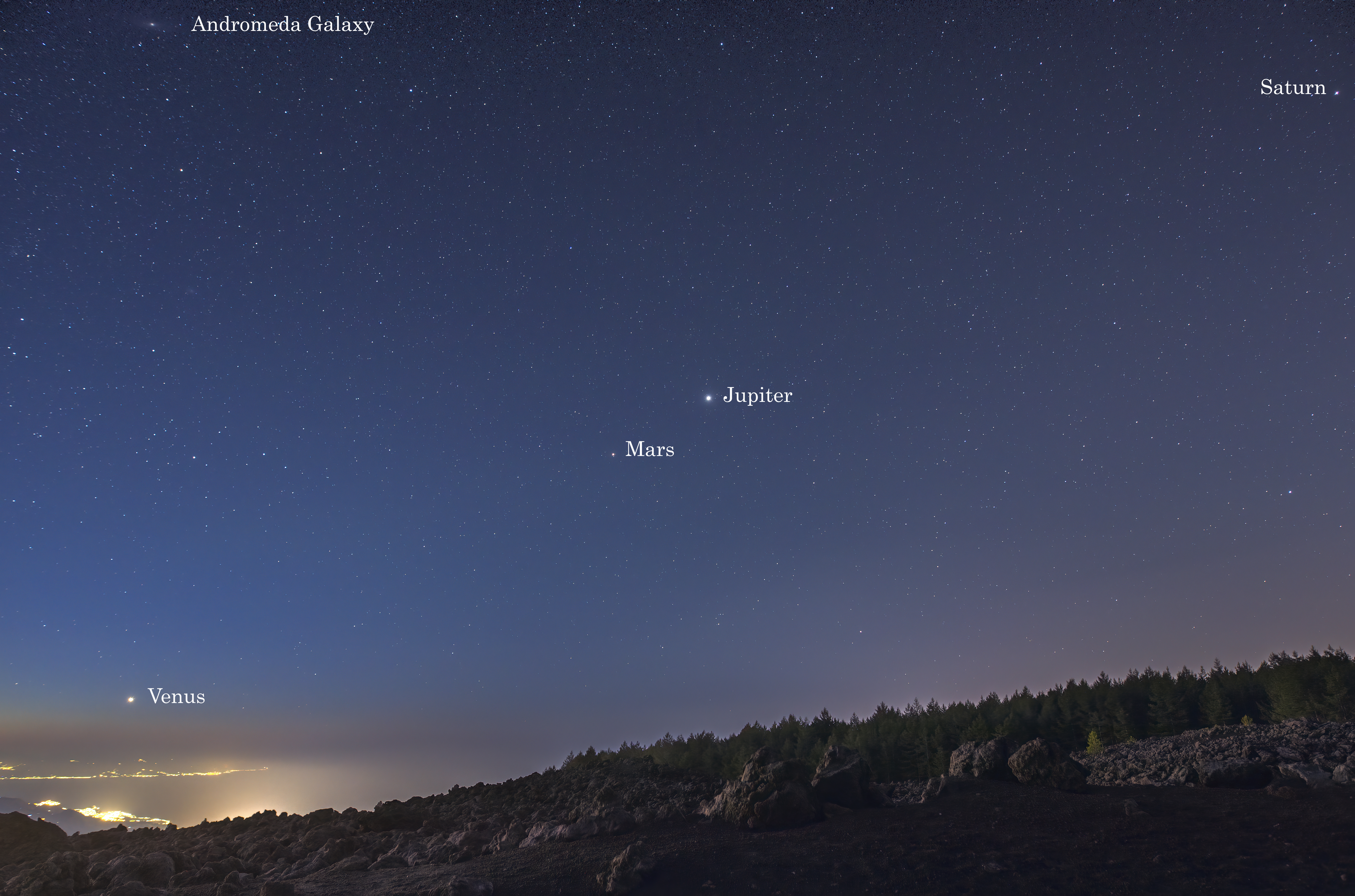 Venus, Mars, Jupiter, Saturn and the Andromeda Galaxy at dawn