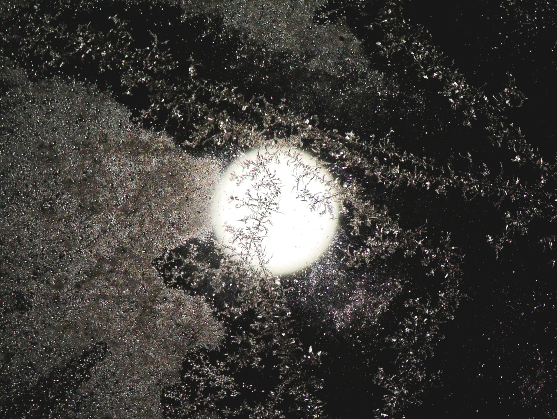 Kurz vor Winteranfang stand der fast noch volle Mond hoch am Himmel. Auf der Scheibe des Dachfensters hatten sich Eisblumen gebildet, die ein etwas anderes Mondfoto aus dem warmen Zimmer möglich machten.