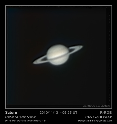 Im Morgengrauen entstand diese Aufnahme vom Ringplaneten. bei schlechten Bedingungen (4/10) und sehr böigem Wind (>25 km/h). Trotzdem ein schöner (und gegenüber dem Frühjahr sehr veränderter Anblick) mit dem wieder ca. 10° offenem Ring