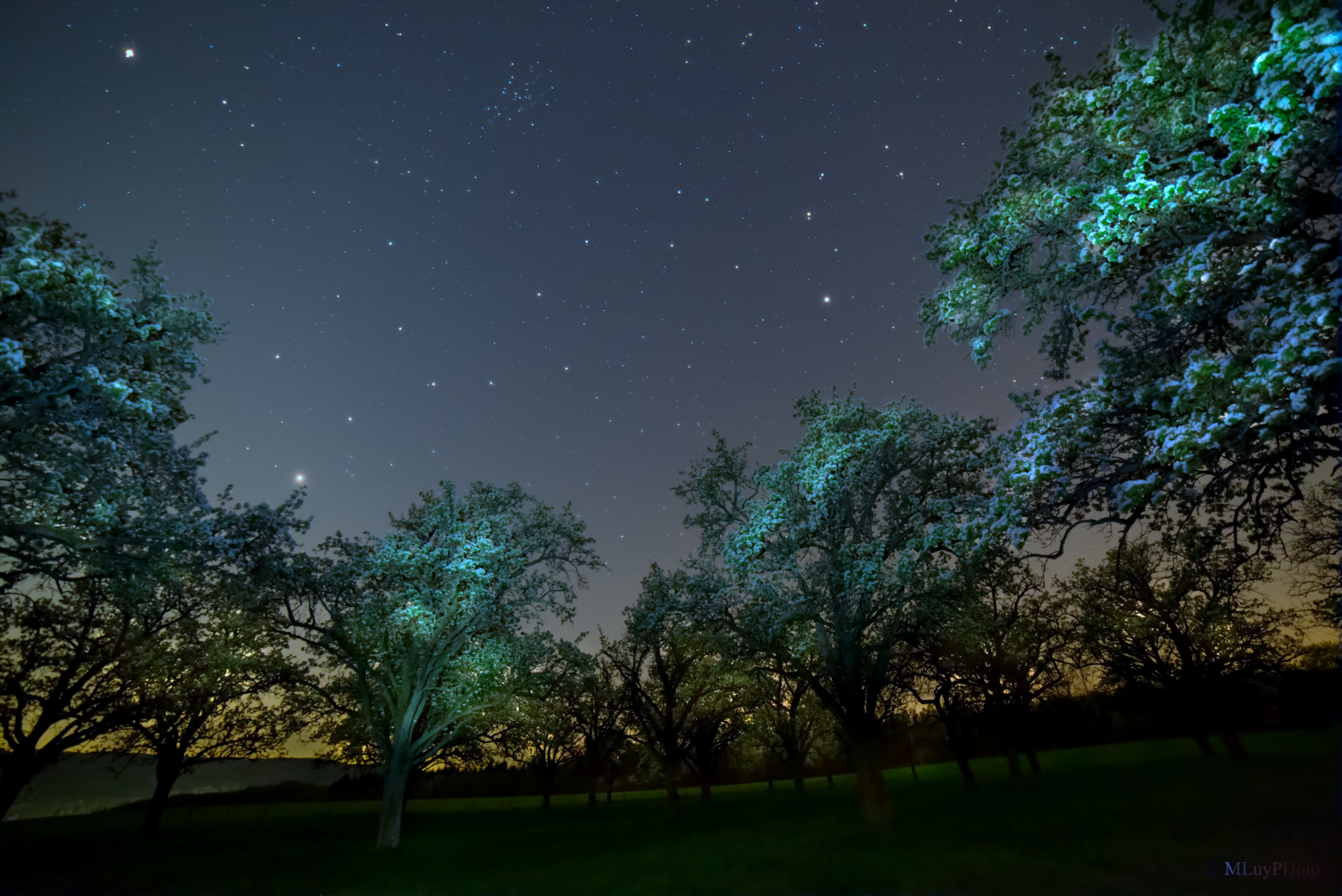 Nein, es ist kein Schnee der hier auf den Ästen der Bäume liegt. Als Vordergrundmotiv dient dem Fotografen eine herrliche, sich in voller Blüte befindliche alte Birnbaumplantage in der Nähe der Ortschaft Oberemmel. Die strahlend hellen Blüten wurden mit einer Taschenlampe angeleuchtet. Darüber dominiert der Frühlingshimmel mit den markanten Sternbildern Bärenhüter, Jungfrau und Löwe. Deren hellen Hauptsterne Arkturus, Spika und Regulus bilden das Frühlingsdreieck, das bis in den Sommer hoch am Firmament steht. Hat man einen dunklen Himmel über sich, ist der offene Sternhaufen Coma Berenices, auch bekannt als Melotte 111, ein echter Hingucker. Es ist April, und es ist Frühling, wohin man auch schaut.