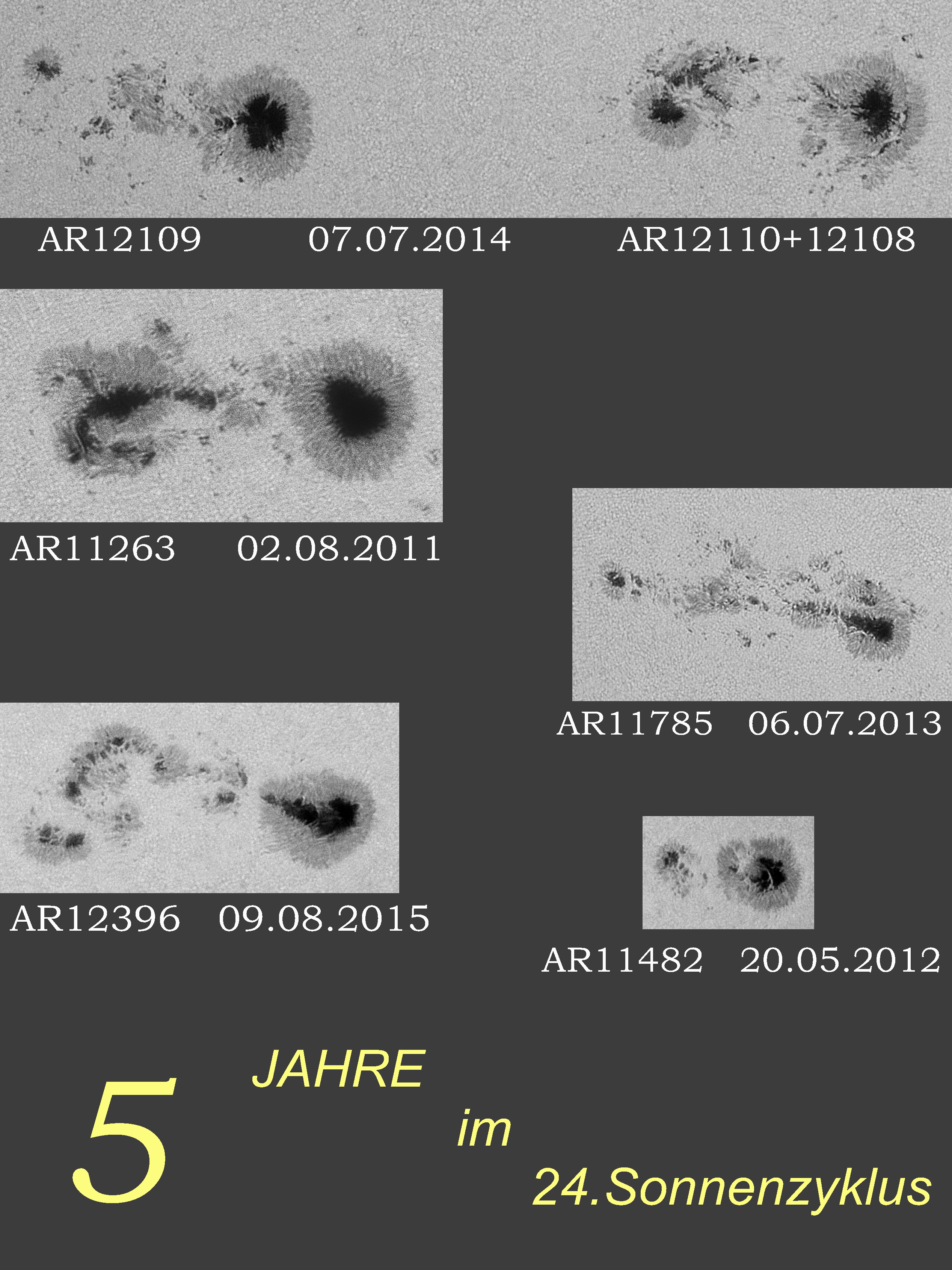Auch wenn der aktuelle 24. Sonnenzyklus nicht gerade der aktivste ist, so hat er doch einige interessante und schöne Sonnenflecken hervor gebracht. Eine kleine Auswahl eigener Beobachtungen habe ich hier mal zusammengestellt. Vielleicht erinnert sich der ein oder andere Sonnenbeobachter ja noch an eigene Beobachtungen.