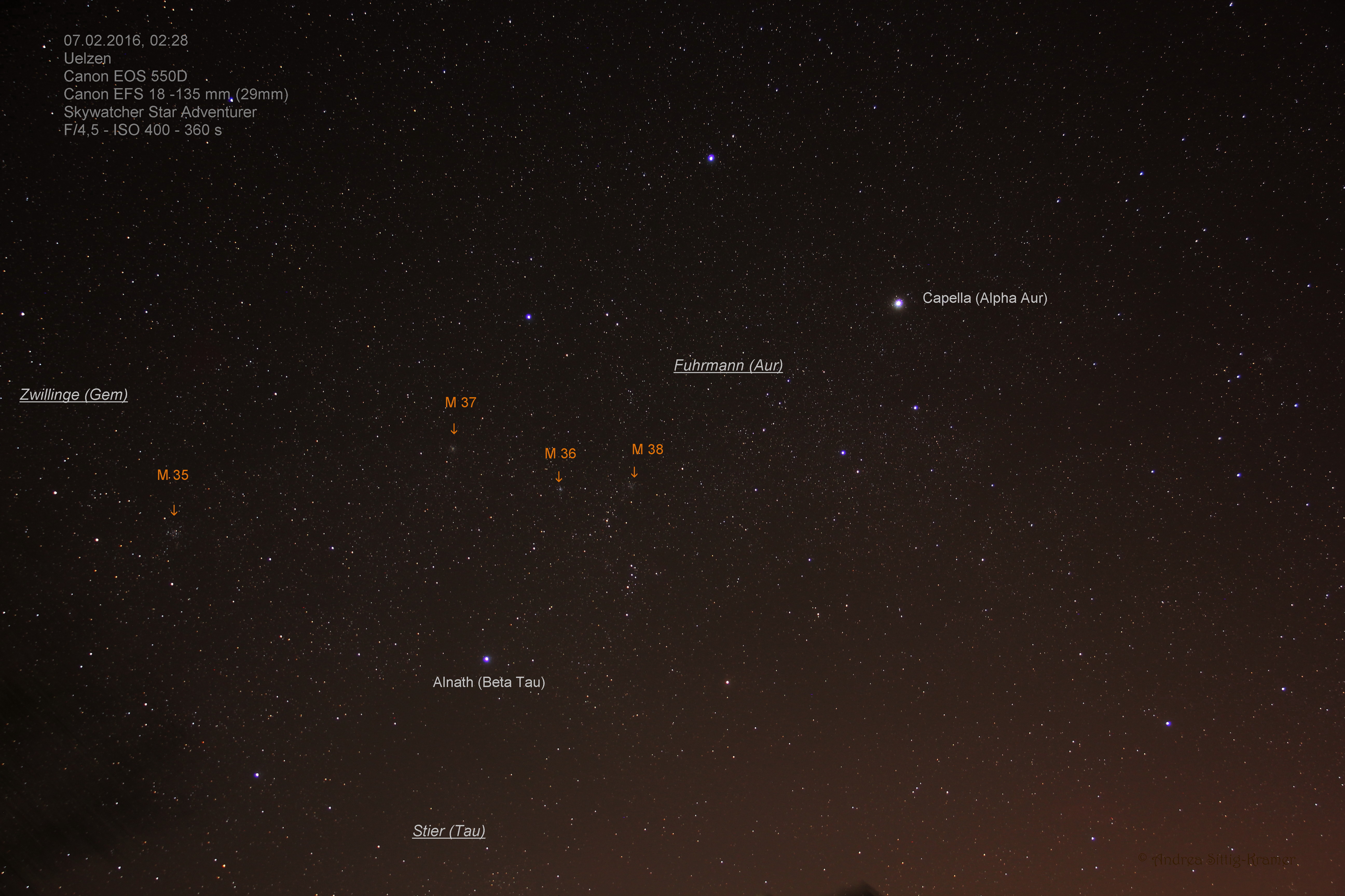 Im Fuhrmann" und den angrenzenden Sternbildern befinden sich zahlreiche Sternenhaufen des Messier-Katalogs, die unter einem guten Heidehimmel attraktive Fernglas- Objekte sind. Diese Details werden auf dem nachgeführten, sechs Minuten (!) belichteten Einzelfoto mit einer normalen Spiegelreflexkamera sehr schön sichtbar – auch ohne nachträgliche Bildbearbeitung