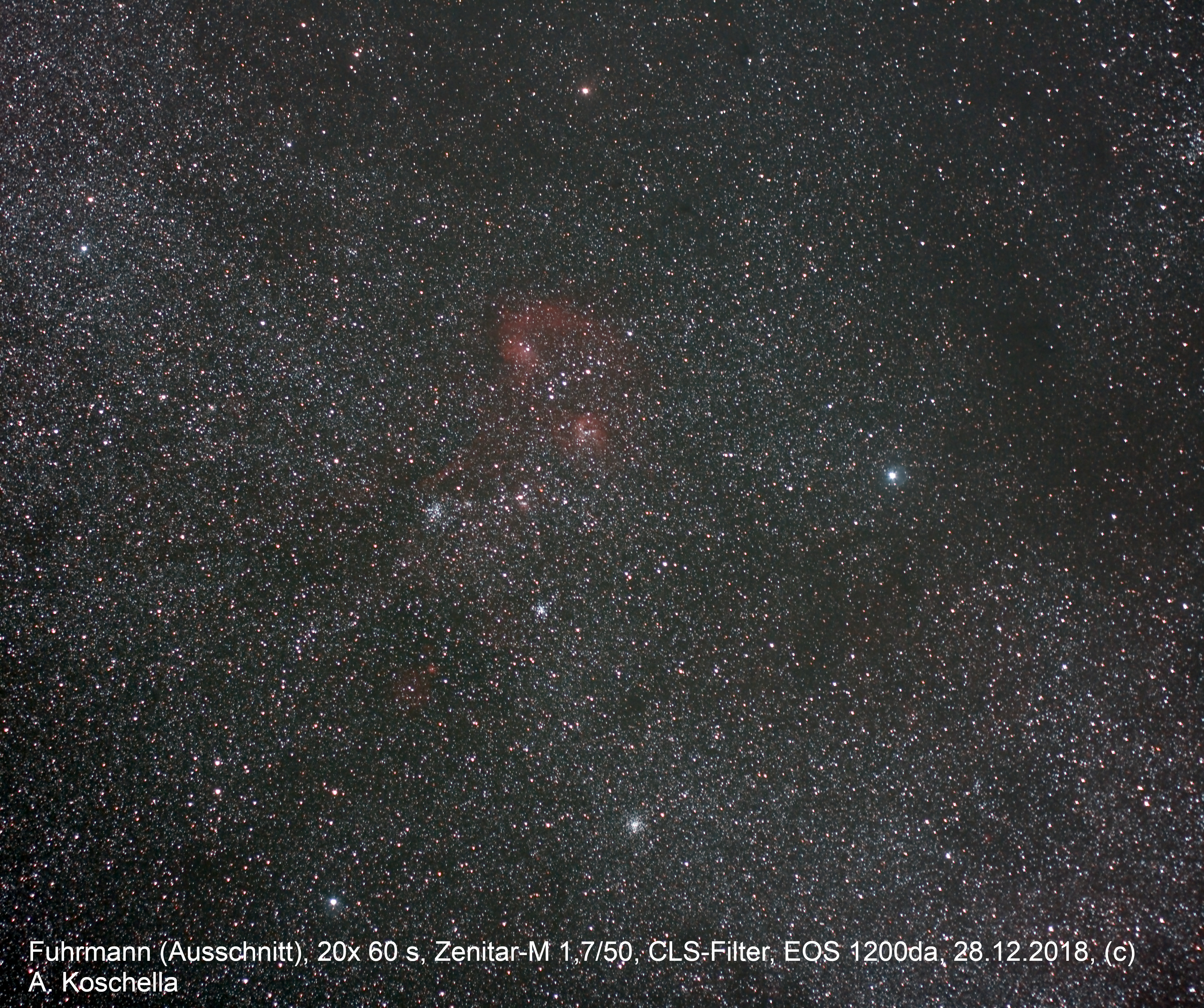 Das Foto entstand während des Silvesterurlaubs neben einer Jugendherberge am Fuße des Feldbergs im Schwarzwald. Als Beobachtungsplatz bot sich leider nur der Parkplatz an, der direkt neben der Durchgangsstraße liegt. Ziel der Aktion war es, die Kamera ausschließlich über Magic Lantern zu steuern, was auch ganz gut geklappt hat. Als Unterbau war eine geliehene Skywatcher Staradventurer dabei. Das Sternbild ist nicht komplett zu sehen, dafür aber drei offene Sternhaufen (M 36, M 37, M 38).