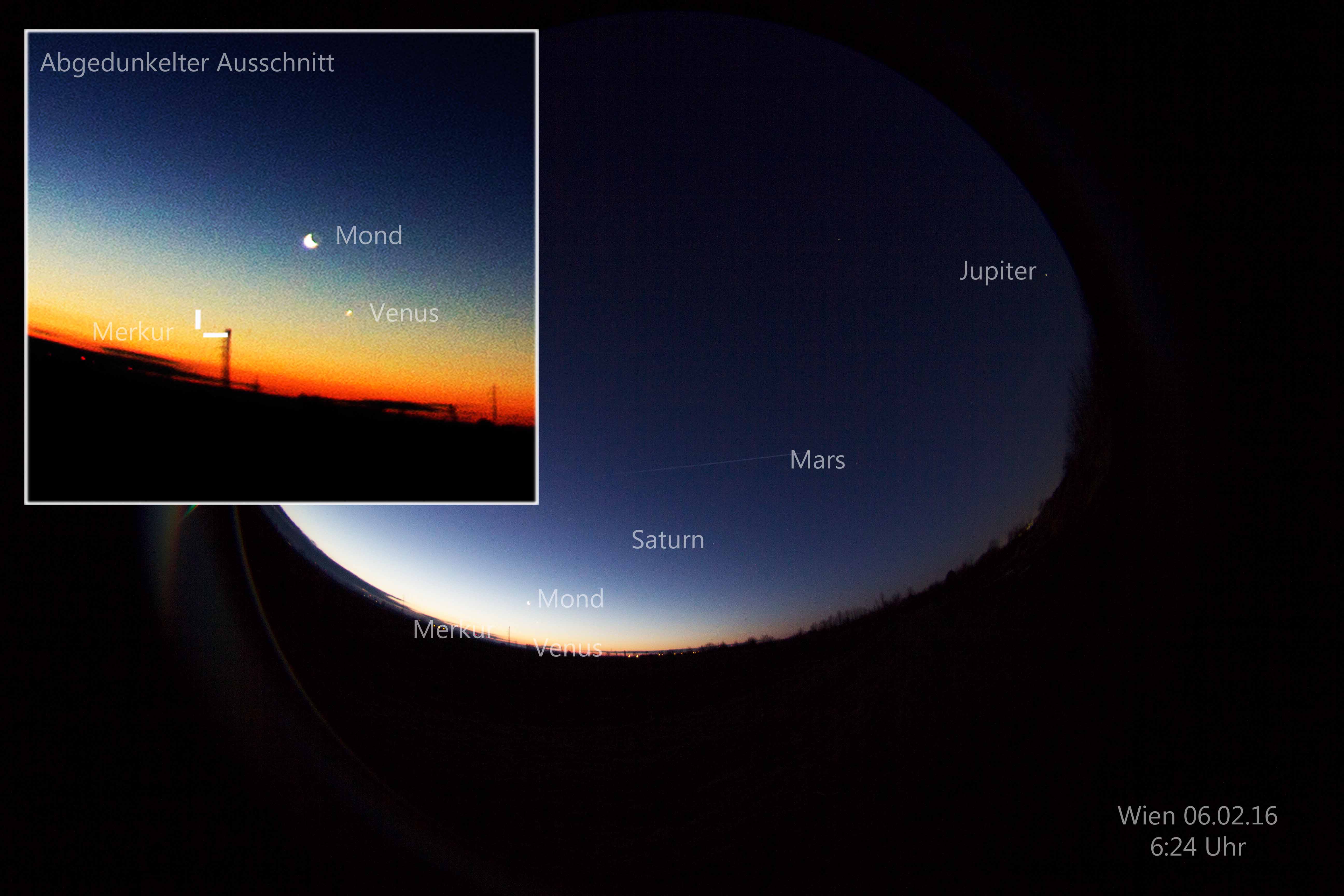 Der früh morgendliche Versuch Jupiter, Mars, Saturn, Venus, Merkur und den Mond auf einem Bild unterzubringen. Als alle Planeten zu sehen waren begann es auch schon zu dämmern. Schwierige Aufnahmebedingungen also …