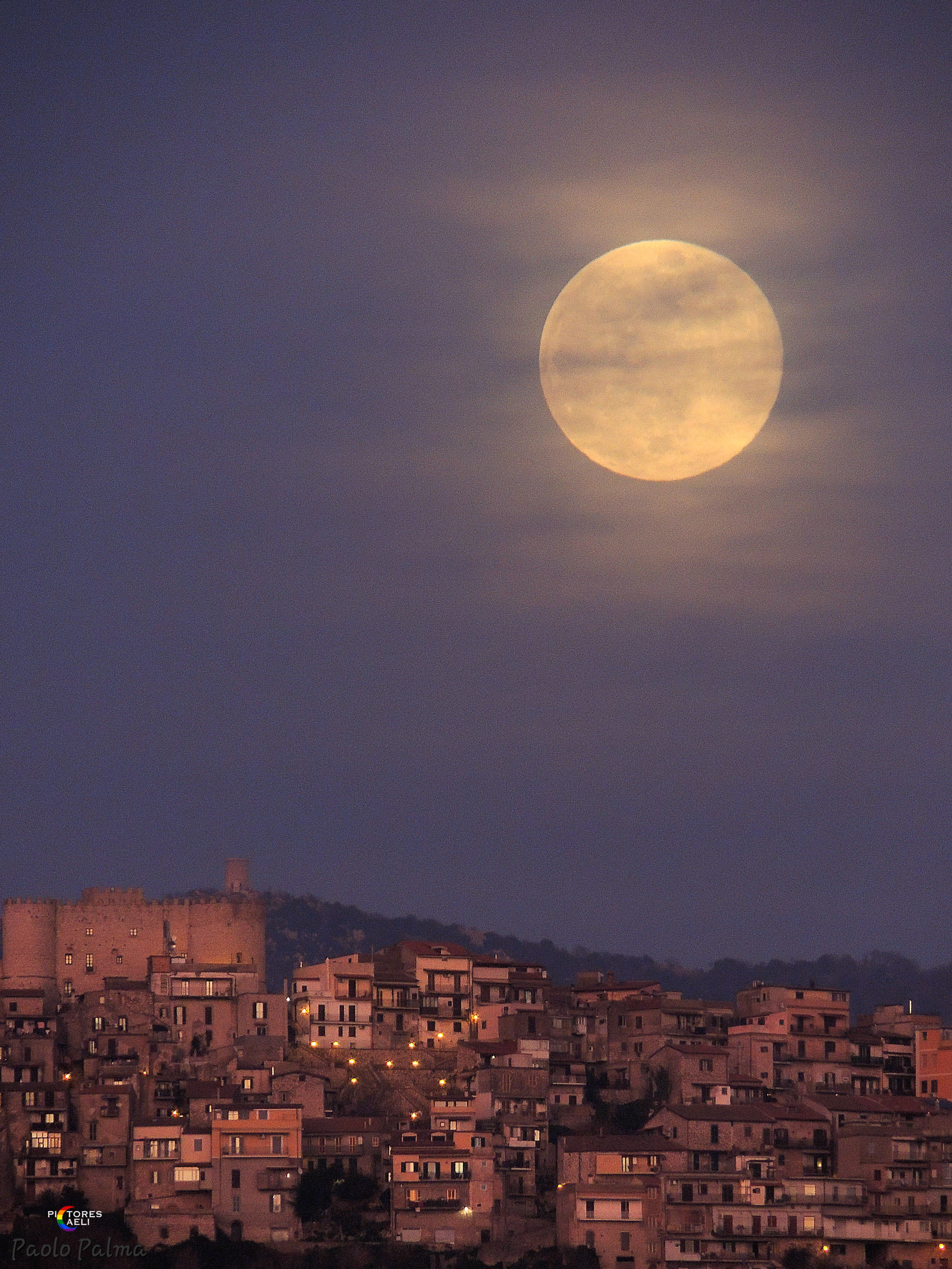 First Full Moon of the year rising over the borgo of Sant'Angelo Romano, near Rome. Single shot taken over 3 km away with a partially veiled Moon. Visible the Ostini-Cesi Castle, an ancient defense bastion of Rome and just »above it«, but 7km even further away, the Cruciani Tower, on top of Mount Gennaro.