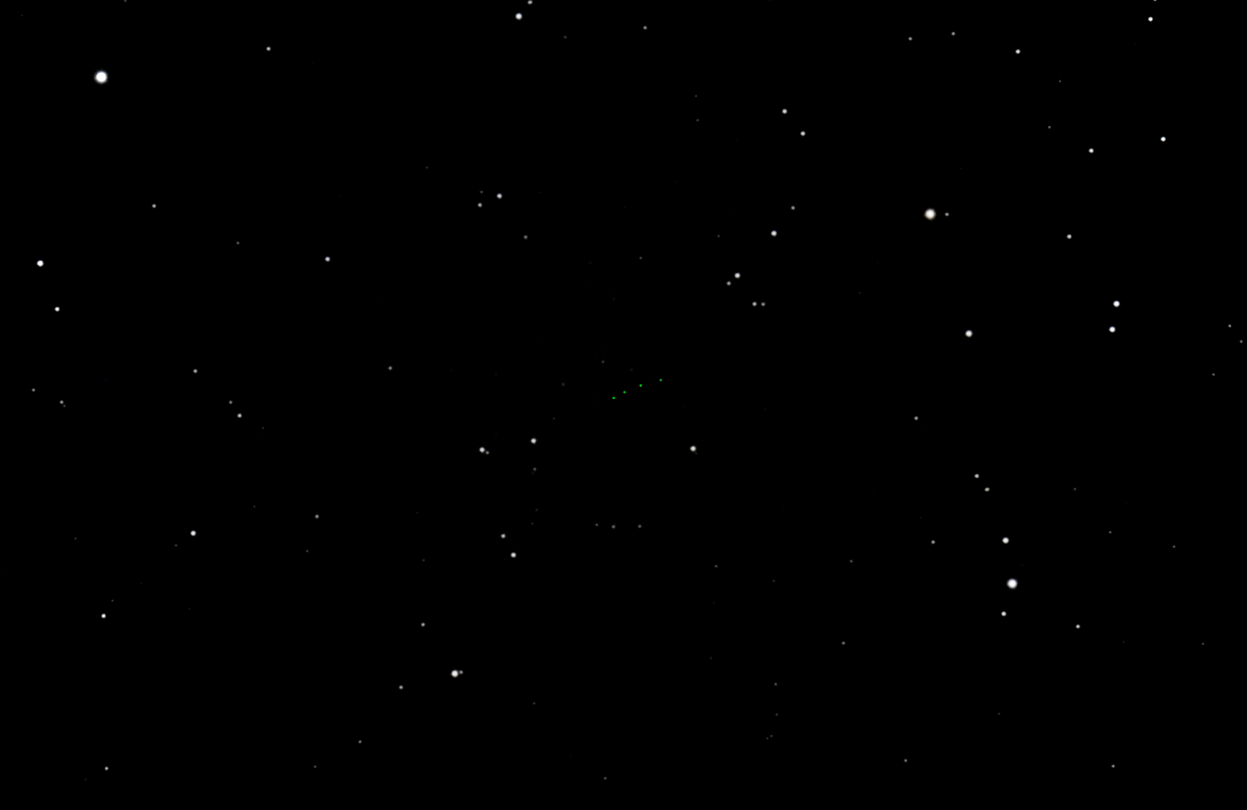 Die Tage der erfolgreichen Astrometriesonde Gaia sind gezählt, siehe Sterne und Weltraum 1/2025. Gaia bewegt sich um den Lagrangepunkt L2 herum, in ungefähr 1.5 Millionen km Abstand von uns. Mitte Januar 2025 wurde das Raumfahrzeug so gedreht, dass das reflektierte Sonnenlicht direkt zur Erde gelenkt wird. Das bedeutet eine Vergrößerung der Helligkeit auf etwa 15 mag, also kann mit Amateurteleskopen ein entsprechender leuchtender Punkt fotografiert werden. Das Bild ist eine Überlagerung von vier Fotos, die am Abend des 27. Januar 2025 zwischen 21:10 und 23:37 Uhr MEZ in der Nähe von Aachen mit einem Celestron C8 aufgenommen wurden. Der etwa 0,5 Grad große Himmelsausschnitt zeigt eine Grenzregion zwischen den Sternbildern Leo und Krebs, die hellsten abgebildeten Sterne erreichen etwa 10 mag. Gaia, im Zentrum, ist der besseren Erkennbarkeit grün eingefärbt. Der zeitliche Abstand zwischen den vier Fotos variiert etwas, da vorbeiziehende Wolken einige Aufnahmen verhindert haben.