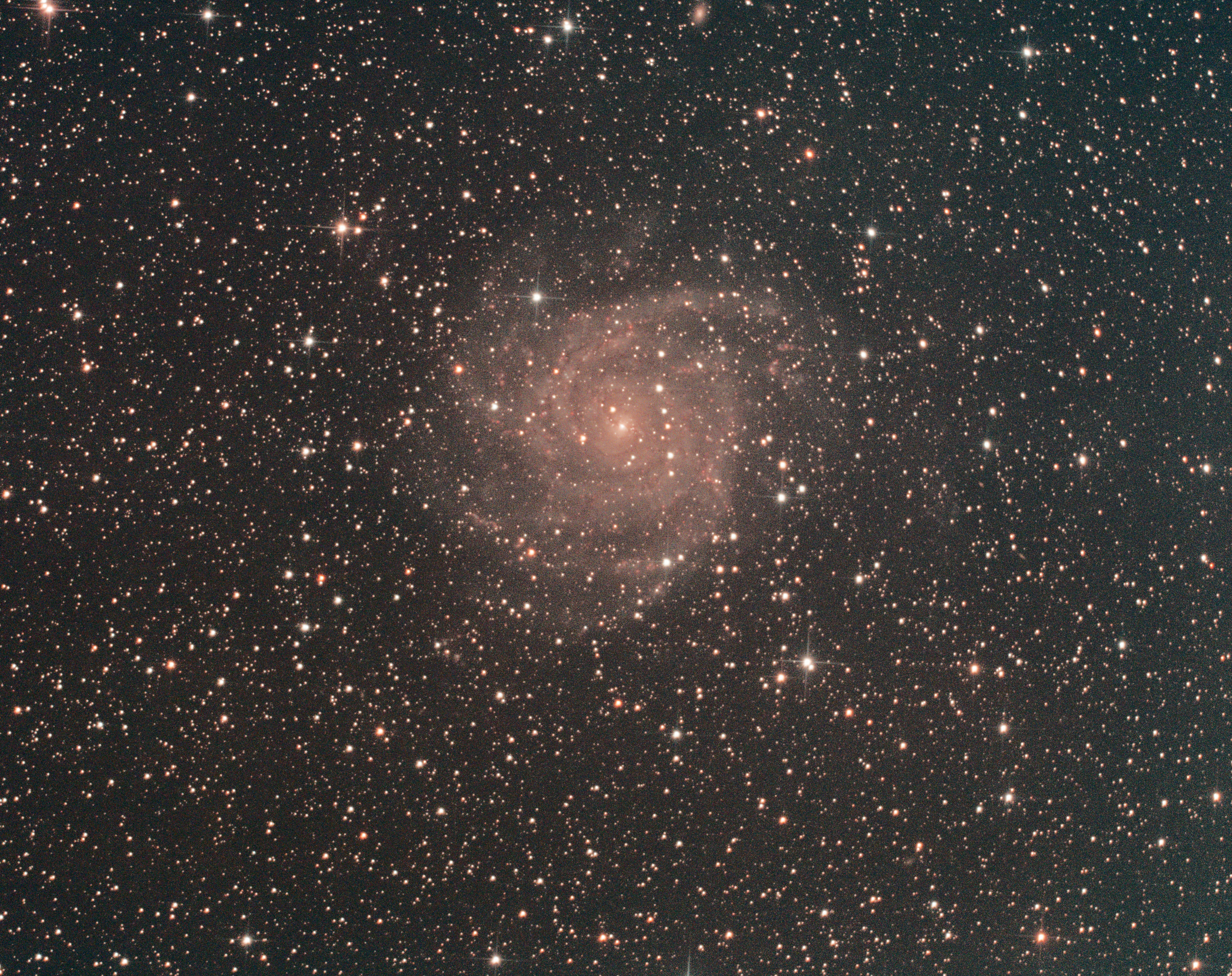 In der Nacht vom 2. auf den 3. Dezember 2016 konnte ich mich nach einer gefühlten Ewigkeit von meinem Kleingarten am Stadtrand Kiel aus endlich wieder einmal der Astrofotografie widmen. So nahm ich mir (trotz Skybeamer !) die schon lange auf meiner to do-Liste stehende Face On-Galaxie IC 342 vor. Das Licht dieser Galaxie wird durch kräftige interstellare Absorption deutlich geschwächt, liegt sie doch von der Erde aus gesehen in der winterlichen Milchstraße im Sternbild Giraffe. Sie stellt ob ihrer Flächenlichtschwäche eine ziemliche Herausforderung für Astrofotografen dar. Ihre Entfernung vom Sonnensystem beträgt etwa 11 Millionen Lichtjahre, was IC 342 zu einer der uns nächstgelegenen Galaxien macht. Der Durchmesser liegt bei rund 60000 Lichtjahren, was deutlich kleiner als unser Milchstraßensystem ist. Wäre ihr Licht nicht so geschwächt, gehörte IC 342 sicherlich zu den eindrucksvollsten beobachtbaren Welteninseln an unserem Himmel.