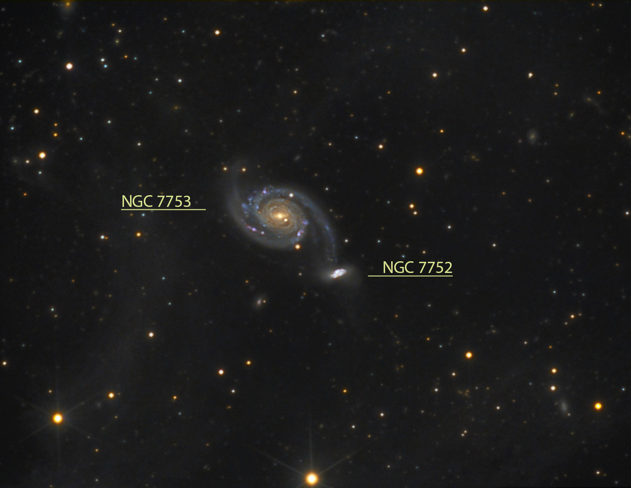 NGC 7753 im Sternbild Pegasus ist rund 240 Millionen Lichtjahre entfernt und hat einen Durchmesser von etwa 230000 Lichtjahren. Sie steht in Wechselwirkung mit dem Begleiter NGC 7752, zusammen bilden sie das Arp-Objekt mit der Nummer 86. NGC 7753 ist eine Balkenspiralgalaxie mit kleinem Kern und schmalem Balken, NGC 7752 ist ebenfalls eine Balkenspiralgalaxie mit zirka 55000 Lichtjahren Durchmesser und in Verbindung mit einem Arm von NGC 7753. Das Paar ähnelt sehr dem Paar M 51/NGC 5195.