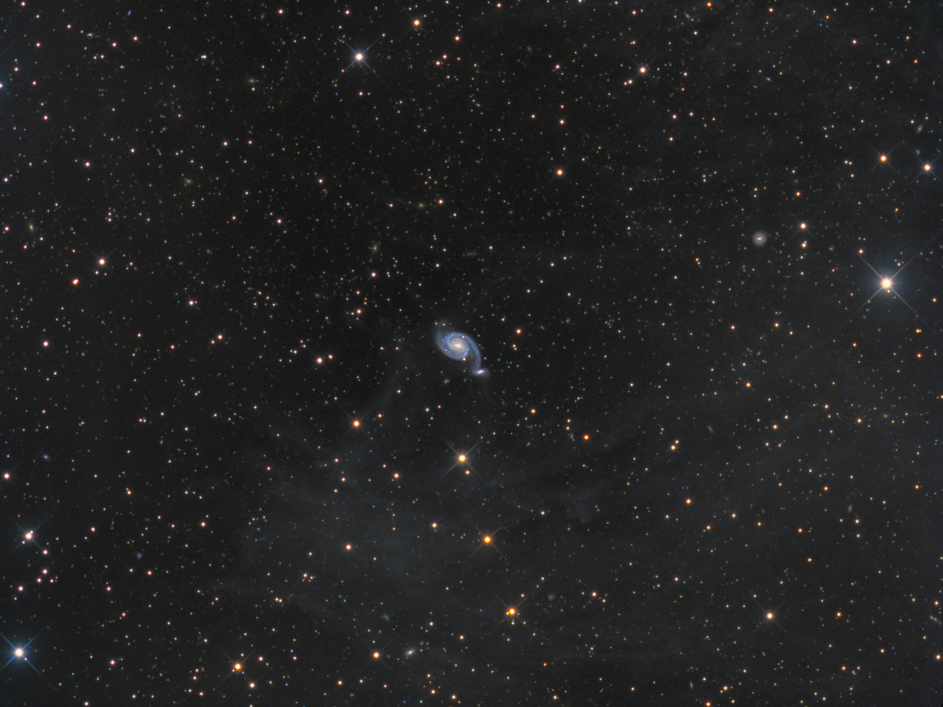 An insgesamt fünf Terminen im September und Oktober 2018 habe ich Arp 86 im Pegasus insgesamt 17,6 Stunden in LRGB belichtet. Aus früheren Aufnahmen von Galaxien im Bereich des Sternbildes Pegasus war mir bekannt, dass diese Gegend reich an Galaktischem Zirrus ist. Ich habe versucht, durch entsprechend ausgiebige Belichtung davon viel in die Rohdaten zu bringen. Die besondere Kunst ist es jedoch dann, Galaxien und Zirrus in ausgewogener Weise im Bild darzustellen.