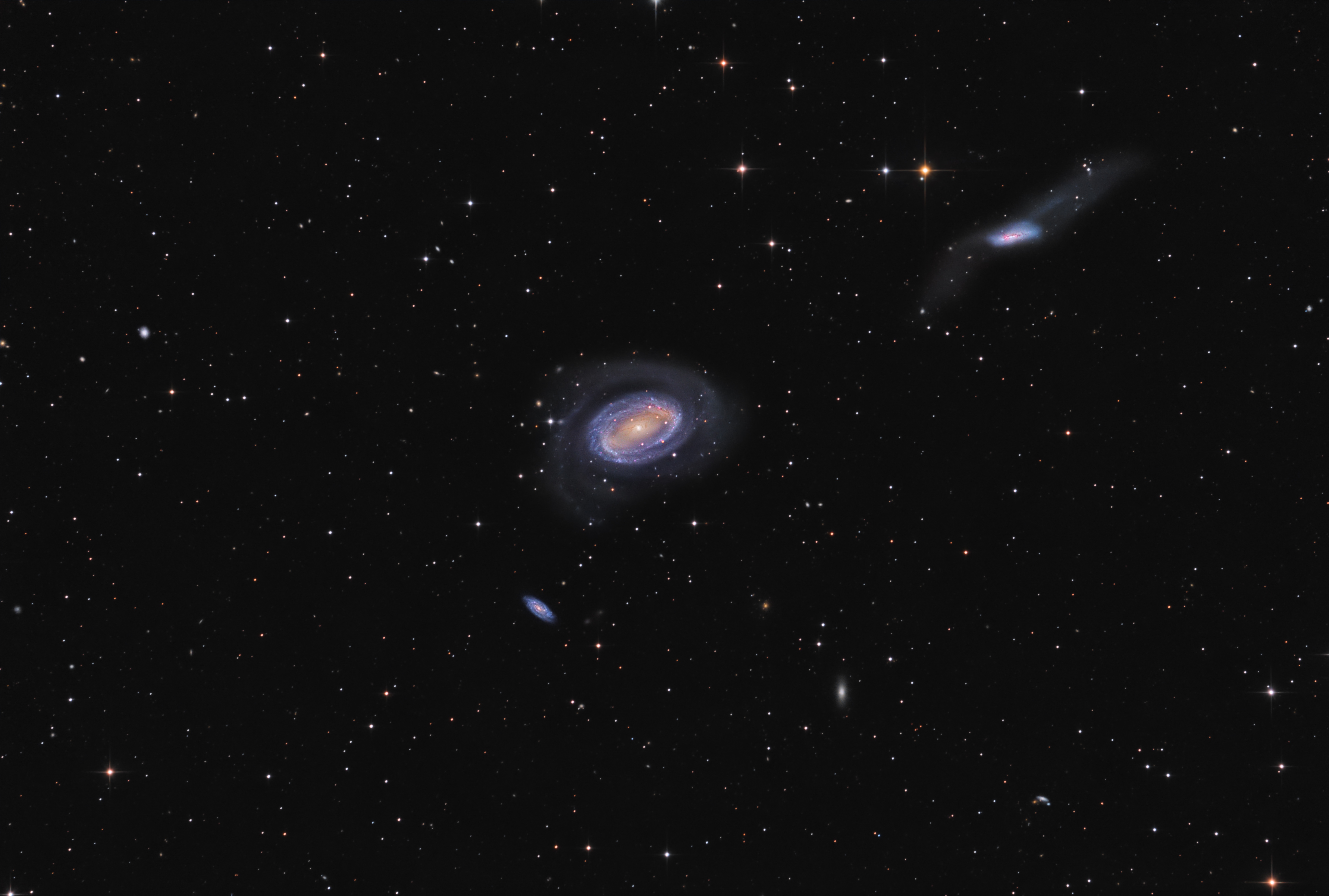 Zielt man auf die einarmige Balkenspirale NGC 4725, so bekommt man gleich noch zwei weitere auffällige Exemplare ins Bild. NGC 4747 ist wohl im gravitativen Einfluss von NGC4725 und zeigt dadurch einen ausgeprägten Gezeitenschweif. NGC 4712 ist wegen der deutlich größeren Entfernung auch erheblich kleiner im Bild. Ich habe hier auch ein neues Filter geprüft, das vor allem Lichtverschmutzung ausblenden soll ohne die Farben signifikant zu verzerren. Mir scheint, dass dadurch H-Alpha-Regionen noch etwas deutlicher zur Geltung kommen.