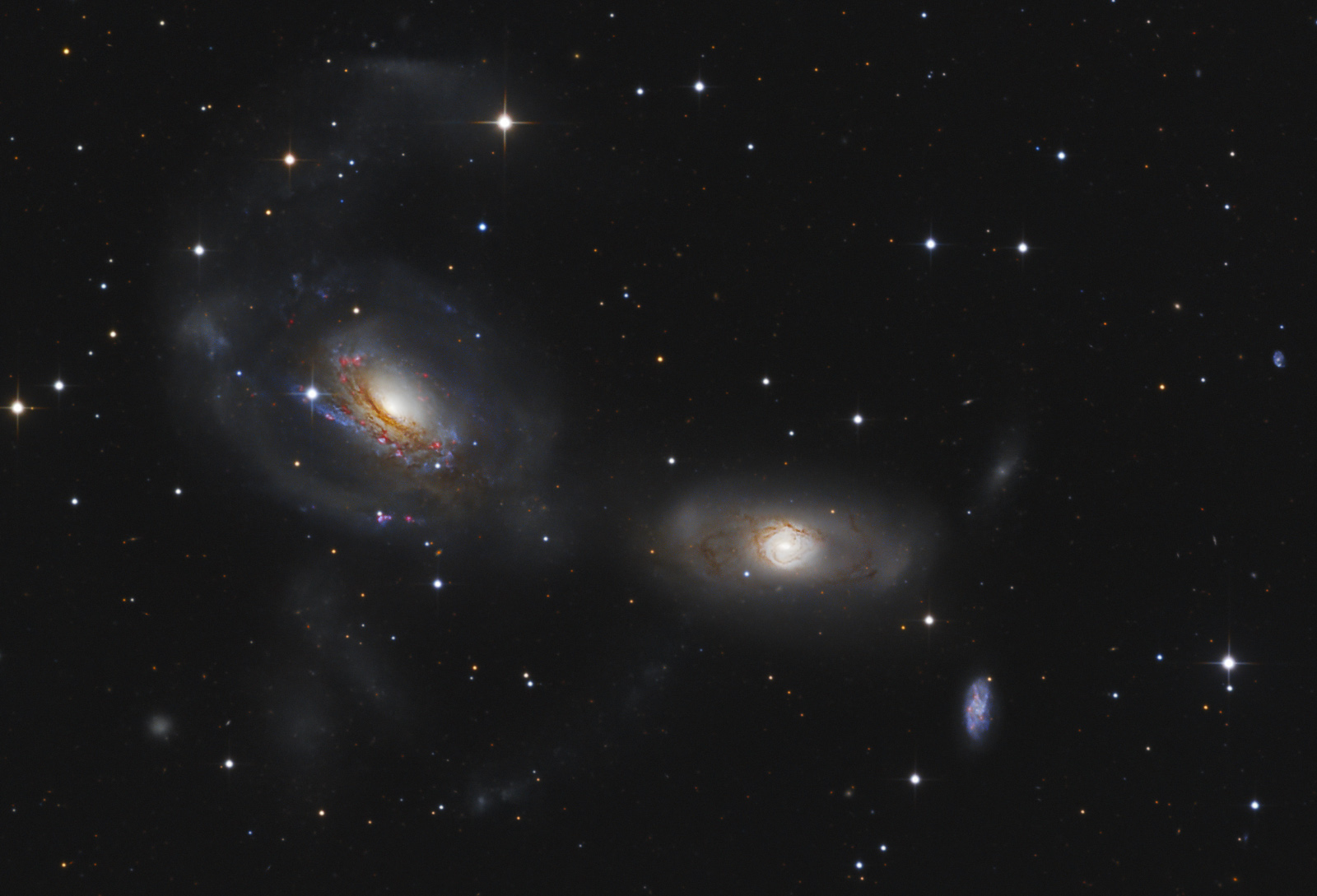 Dieses Bild wurde mit dem BTB Hauptinstrument, einem 60-cm-Newton kombiniert mit einem Big Paracorr bei f/4 am Brentenriegel, Burgenland, im März bis April, über sieben Nächte verteilt, insgesamt ca. 19 Stunden aufgenommen. NGC 3166 (unten rechts) und NGC 3169 (oben links) sind zwei Spiralgalaxien, die in einer Todesspirale gefangen sind. Wenn diese beiden Galaxien zu verschmelzen beginnen, beginnen sie, auseinandergezogen zu werden. Die schwachen Streifen, die NGC 3169 umgeben, sind seine äußeren Spiralarme, die abgezogen werden. Schließlich werden diese beiden Galaxien zu einer einzigen Galaxie verschmelzen. NGC 3165, die kleine Galaxie unterhalb von NGC 3166, gehört ebenfalls zu dieser Gruppe.