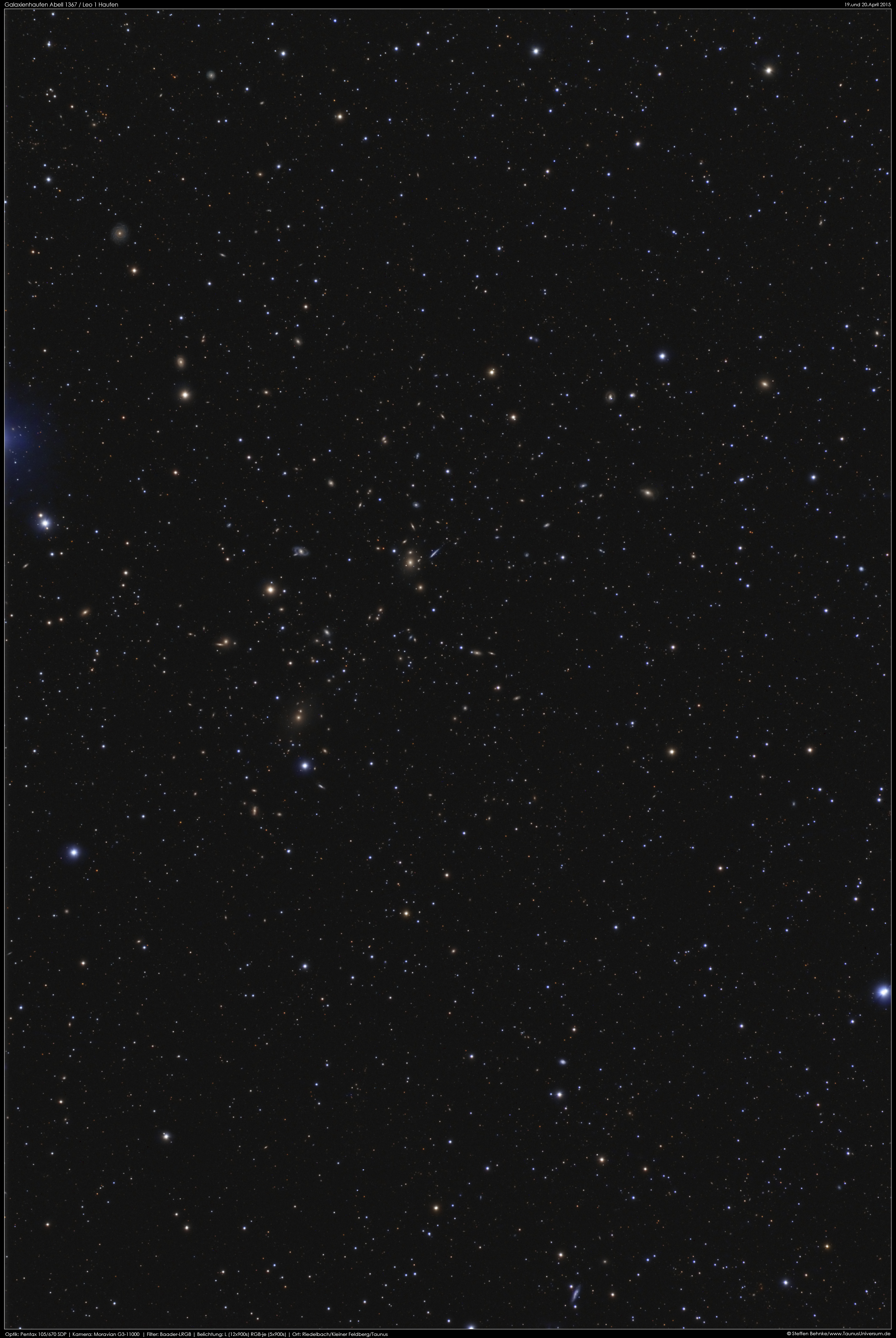 Der Galaxienhaufen Abell 1367 oder auch Leo I Haufen genannt befindet sich ein paar Grad nördlich vom Stern Denebola im Sternbild Löwen. Die Aufnahme entstand mit dem "Pentax 105/670 SDP" und der Moravian G3-11000 in Riedelbach im Hintertaunus in zwei Nächten. Belichtet wurde insgesamt 6,75 Stunden aufgeteilt in L (12 x 900 s) und RGB je (5 x 900 s).