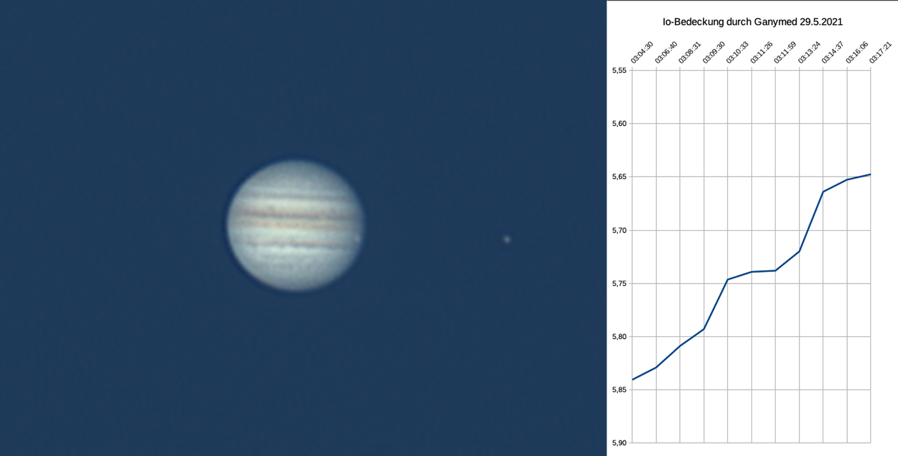 Jan Hattenbach hat in SuW 5/2021 die besonderen Ereignisse der Jupitermonde für 2021 zusammen gestellt. Am 29. Mai schaute ich deshalb am frühen Morgen gespannt aus dem Fenster: Leider zogen Wolken heran und nahmen eindeutig Kurs auf Jupiter und seine Monde! Nach dem Höhepunkt der Verdunkelung des Mondes Io durch Ganymed war die Sicht wieder frei. Schnell ging es ans Teleskop und noch ein paar Aufnahmen gelangen vom Schauspiel: Europa (nicht im Bild) nahm ich als Referenz. Er war anfangs deutlich heller als Io. Aber dann wurde Io schnell wieder heller. Das Ende der Finsternis konnte ich in einem Diagramm dokumentieren (Helligkeit von Io ist in mag angegeben über die Zeit).