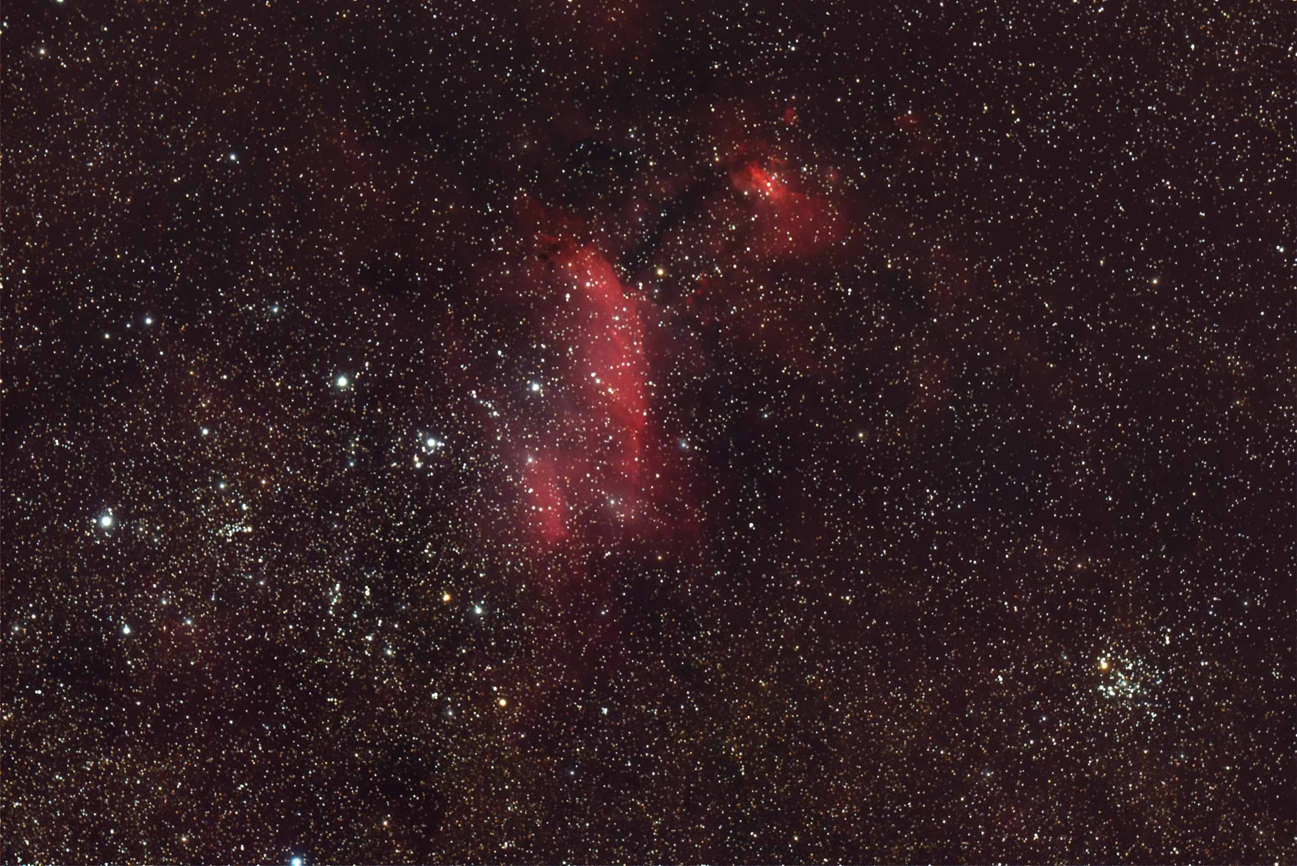 Bei unserem ersten Namibia-Urlaub, den meine Frau und ich unter anderem auf der Astrofarm Kiripotib verbracht haben, war der Garnelen-Nebel eines meiner Wunschobjekte. Leider waren von den sechs Nächten zwei ziemlich bewölkt und zwei, was für den namibischen Winter recht ungewöhnlich ist, sehr feucht. Sehr nette Gastgeber, die anderen tollen Gäste und dieser unbeschreiblich Südhimmel, ließen aber die Freude an unserem Hobby, den ich unter anderem mit einem 24-Zoll-Dobson noch krönte, nicht im geringsten schmälern.