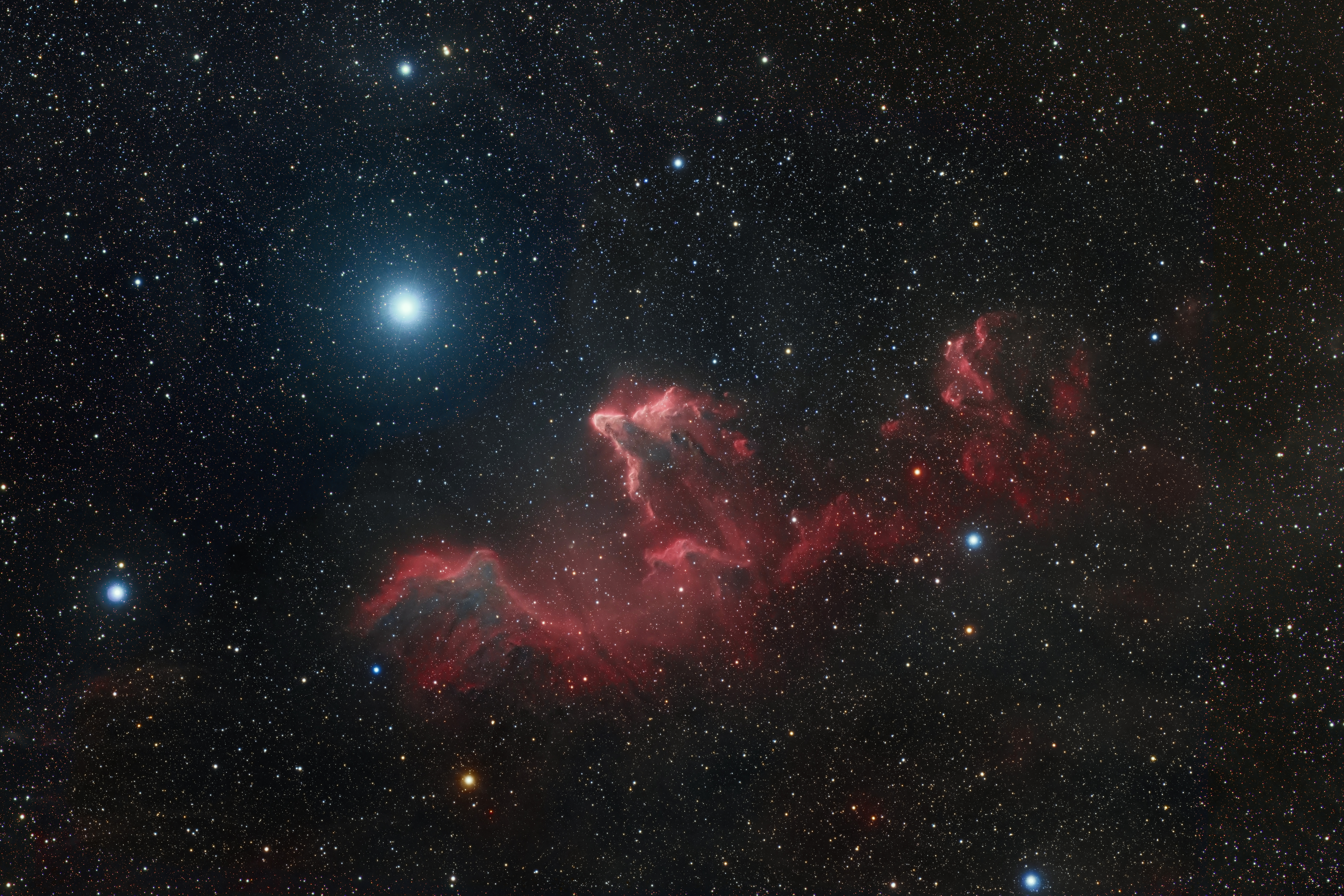 Der "Geist der Kassiopeia": IC63 mit IC59 und Gamma Cassiopeiae. In zwei Nächten im Oktober konnte ich diese spannende Himmelsregion fotografieren. Für das gezeigte Bild habe ich Aufnahmen im H-Alpha-Licht mit RGB-Aufnahmen kombiniert. Die Gesamtbelichtungszeit beträgt fast 9 Stunden.