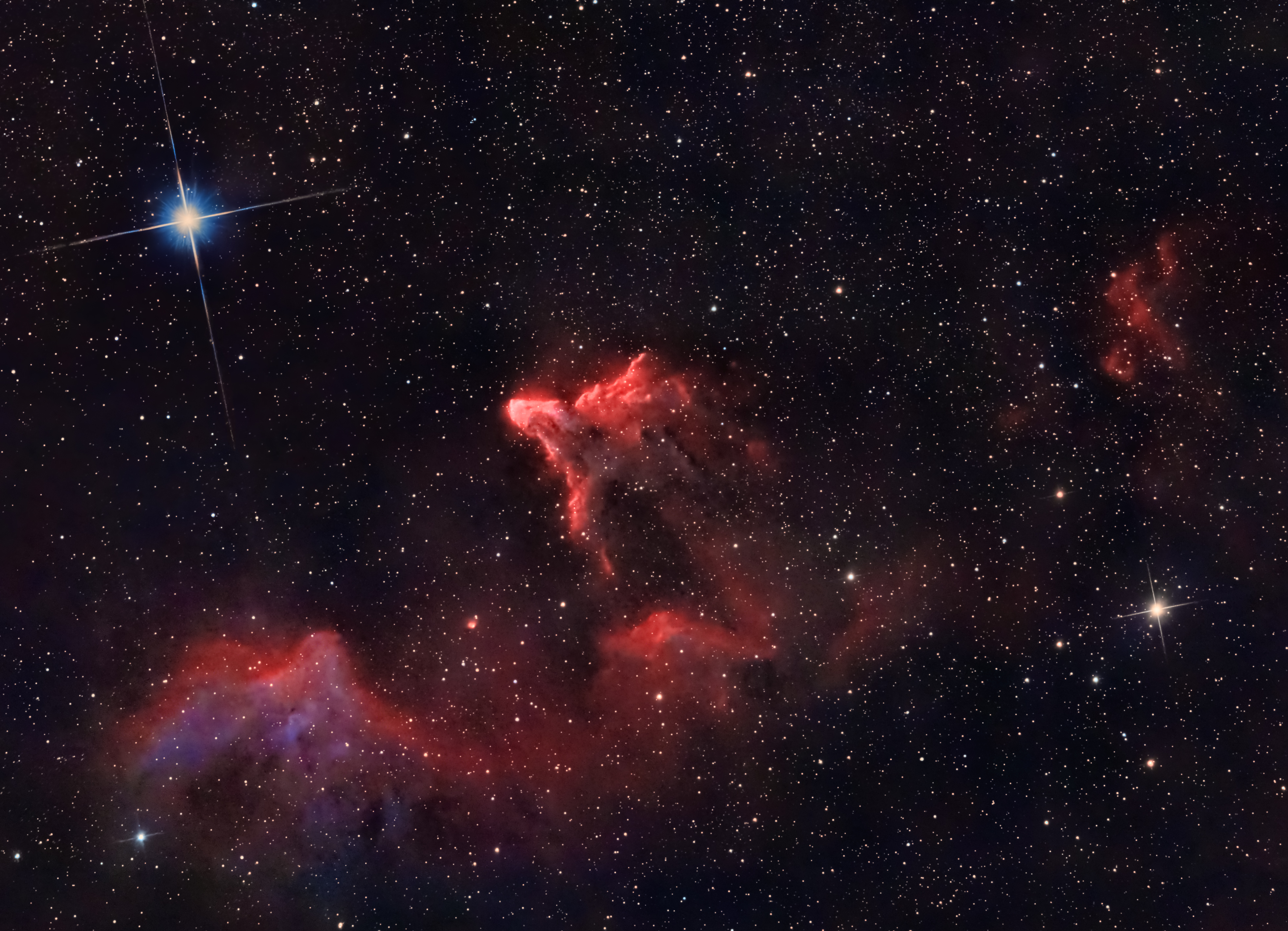 IC 63 ist ein Gebiet aus Wasserstoffwolken und Staub, das 550 Lichtjahre entfernt in Richtung des Sternbilds Kassiopeia liegt. Die Materie in dieser Region wird ununterbrochen von der ultravioletten Strahlung des nahegelegenen veränderlichen Sterns Navi (γ Cas, oben links in meinem Bild) bombardiert, der nur drei Lichtjahre vom Nebel entfernt ist und langsam die gespenstische Staubwolke auffrisst und Gas. Dieser blau-weiße Riesenstern ist der Zentralstern des »W«, das sich im Sternbild Kassiopeia befindet. Unten links in meinem Bild ist auch IC 59 zu sehen, eine weitere Gasregion, die ebenfalls von demselben Stern angeregt wird und zusammen mit IC 63 als die Geister von Kassiopeia bekannt ist.