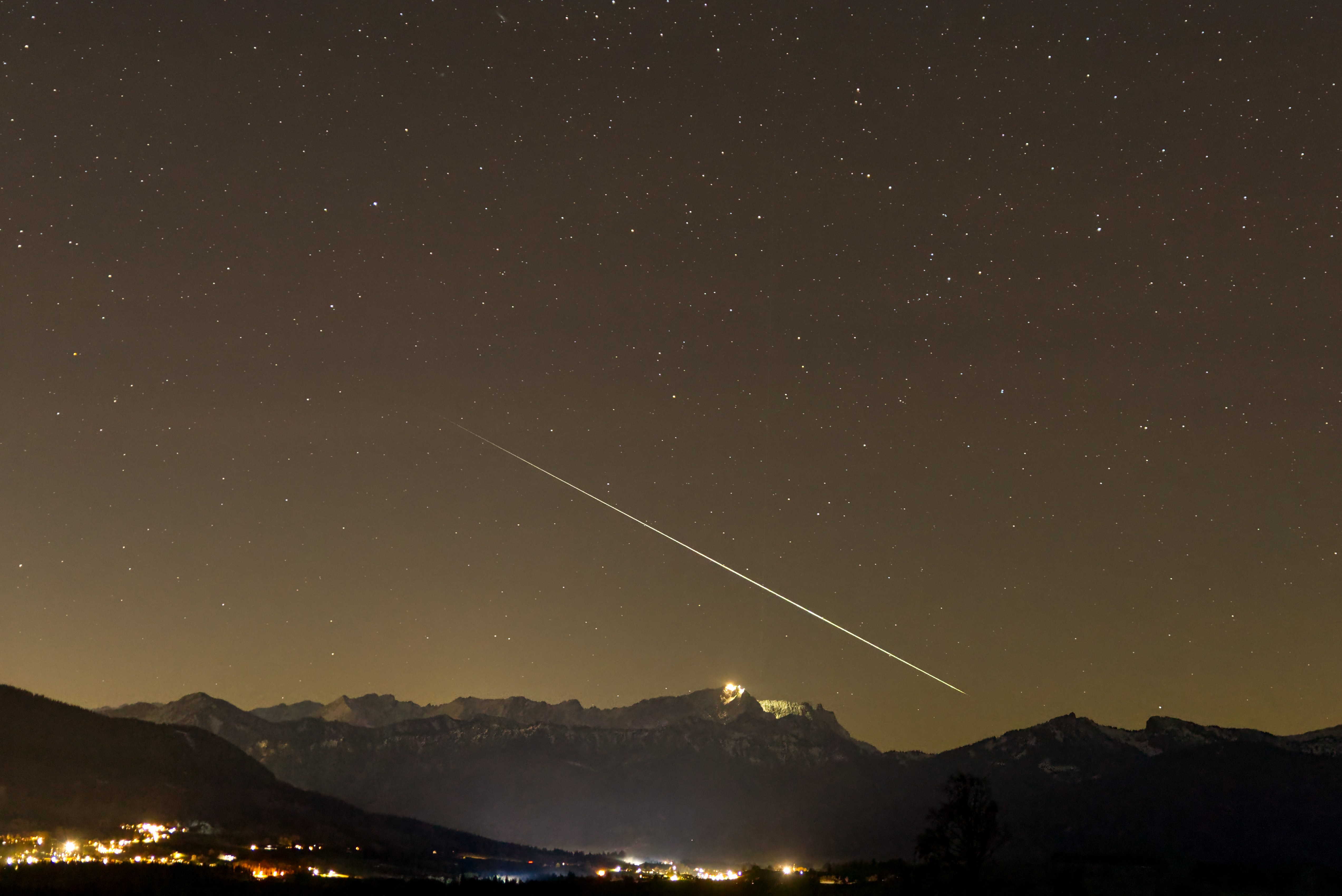 Die Geminidennacht des Jahres stand wieder an, doch wo hin, wenn in München wieder nur Nebel war? Peißenberg? Geigersau? Oder noch weiter in die Berge? Wir entschieden uns für die Geigersau, und wurden belohnt. Der Nebel schwappte zwar zeitweise etwas zu uns herauf, aber die Nacht war weitgehend klar, und so konnten wir viele prächtige Geminiden aufnehmen, u.a. diesen hier genau über der Zugspitze.