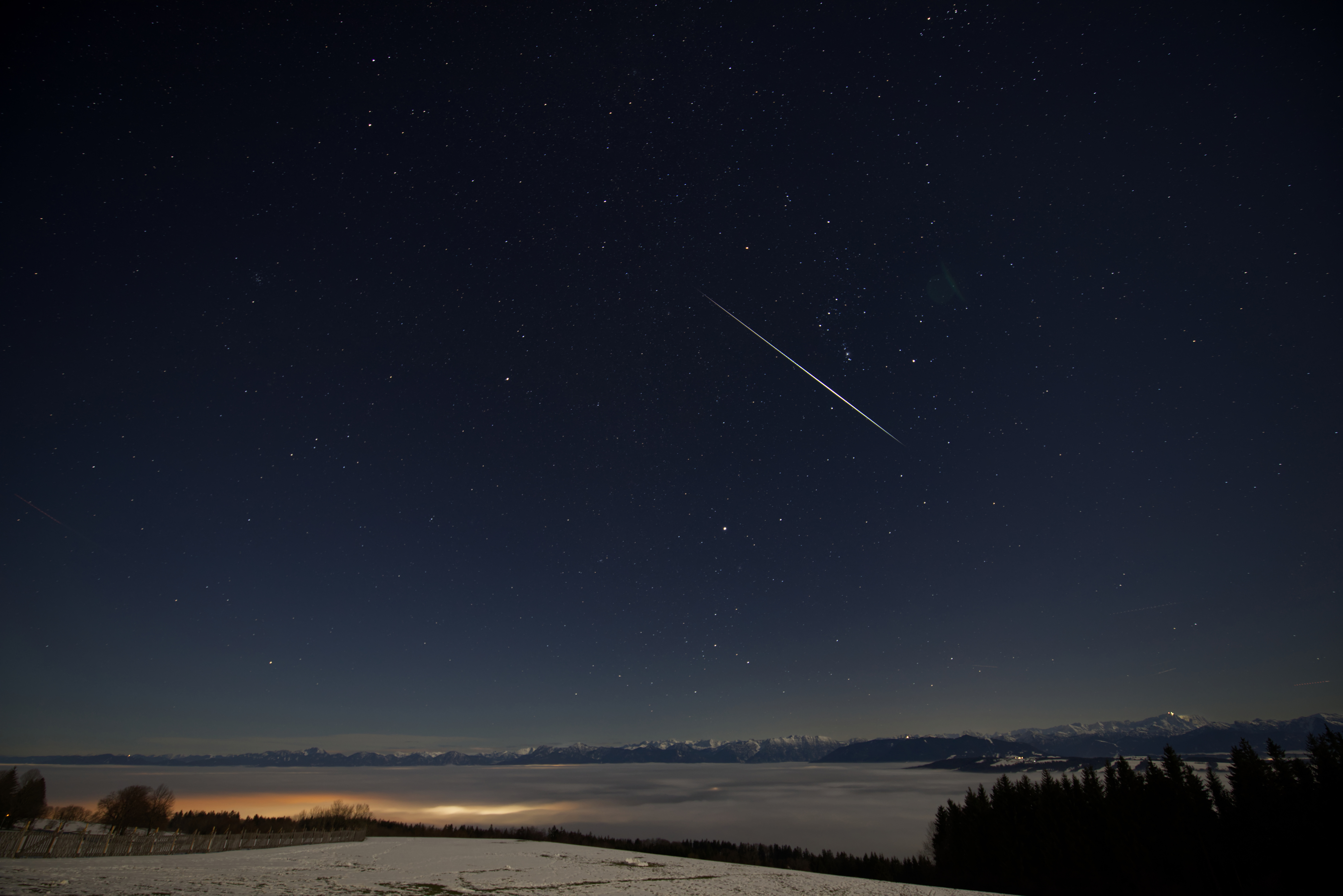 Beobachtungsnacht der Geminiden 2021 am Hohenpeißenberg. Es blieb spannend, ob oben freie Sicht auf die Geminiden möglich ist. Es blieb zum Glück die ganze Nacht klar. Der Nebel mit den darunter liegenden Ortschaften und der vom Mond beleuchtete Schnee machten die Landschaft vor der Bergkulisse mit der Zugspitze recht dann noch perfekt.