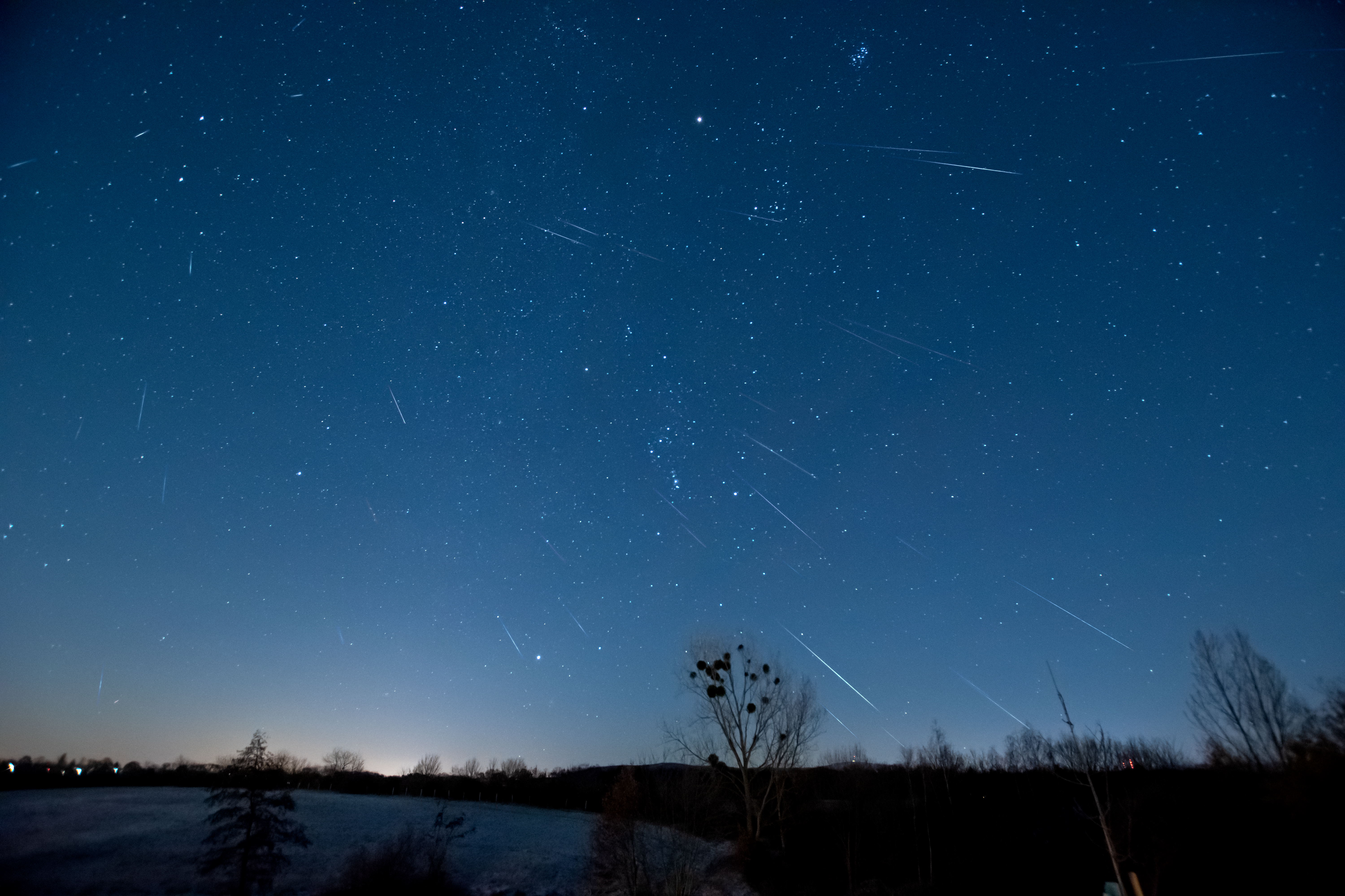Die Geminiden boten am Abend des 14. Dezembers 2022, also einige Stunden nach ihrem Maximum, ein sehenswertes Schauspiel über dem Harz. Das Bild ist eine Collage aus 39 Einzelaufnahmen. Direkt unter dem hellsten Meteor lässt sich Norddeutschlands höchster Berg, der Brocken, mit seinen hell erleuchteten Gebäuden auf dem Gipfel erkennen.