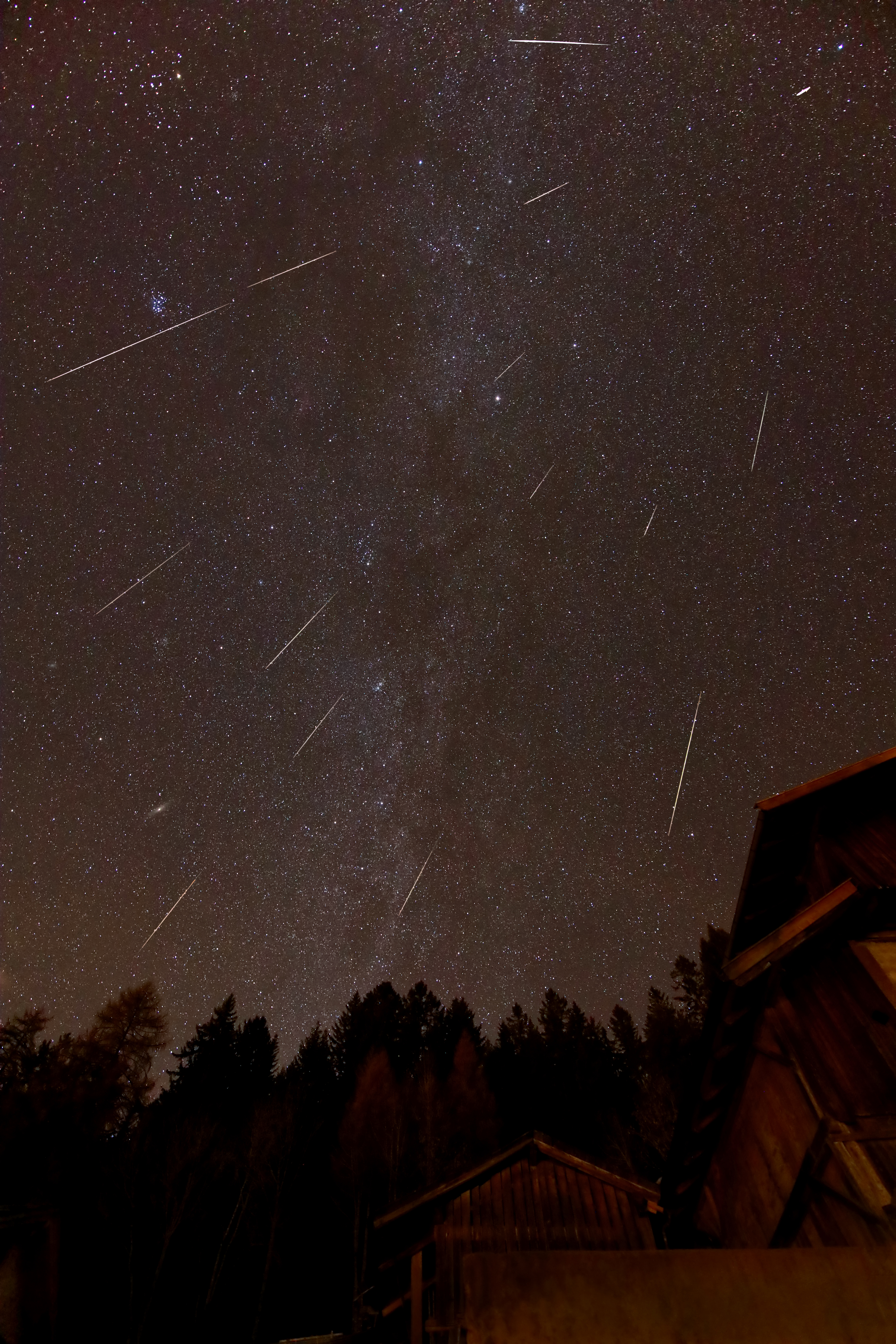 Nachdem das Wetter in Deutschland keine guten Aussichten auf eine Geminidennacht bot, fuhren wir kurzerhand bis Flaas bei Bozen in Südtirol. Die klare Bergluft in 1440 m Höhe ermöglichte uns eine fantastische Geminidennacht, in der auch die Milchstraße deutlich zu sehen war. So entstand diese Aufnahmeserie Richtung Norden, bei der alle auftretenden Sternschnuppen in ein Bild zusammenkopiert wurden. Ein wahrer Sternschnuppenregen ...