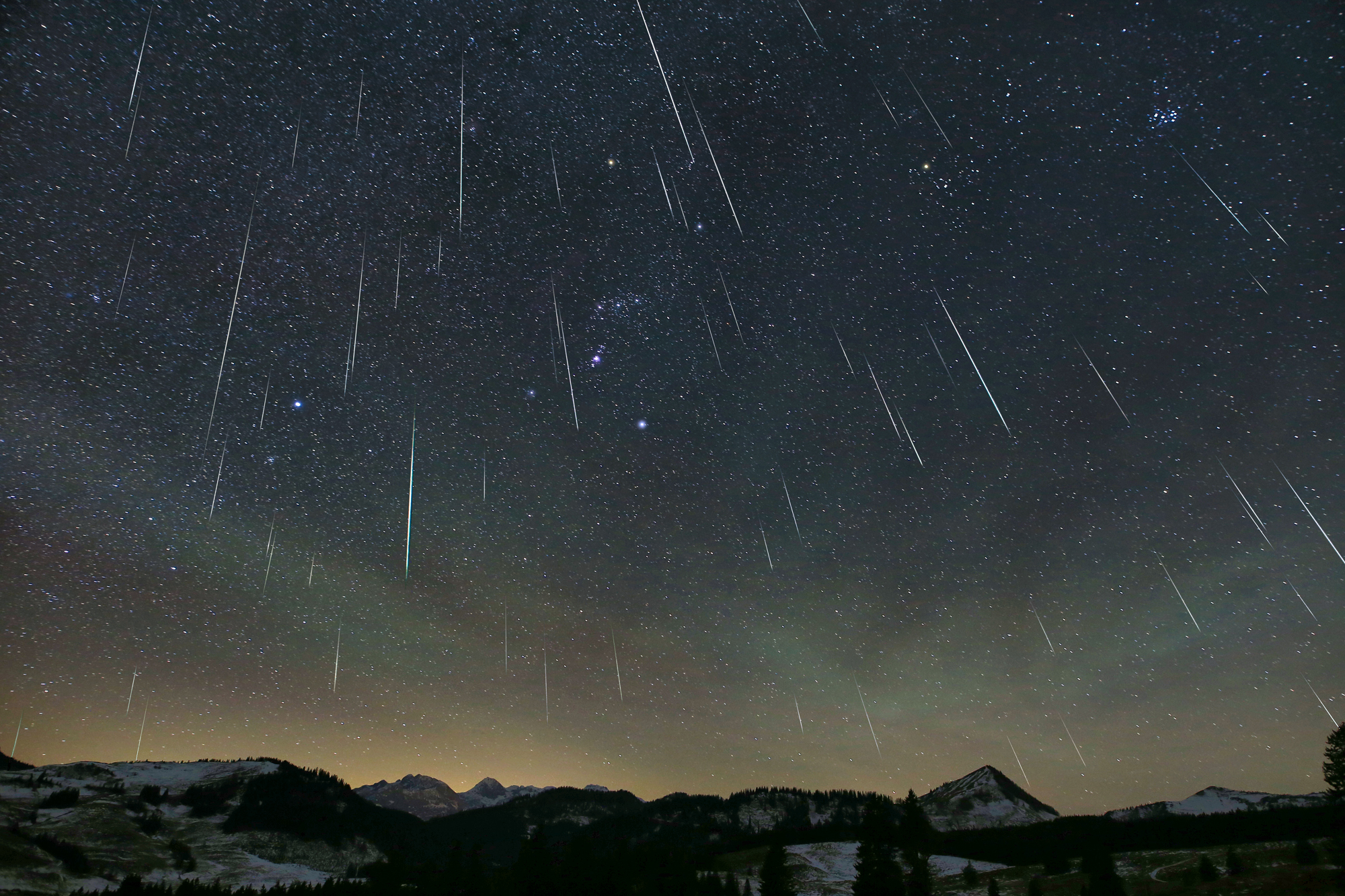 Dass die Geminiden diesmal ein beeindruckendes Schauspiel boten, kann man hier ein wenig nachvollziehen. Zu sehen sind 61 Geminiden mit Blickrichtung SW zu den Wintersternbildern. Zusätzlich gab es noch deutliches Airglow. Sehr gute Bedingungen auf der Postalm oberhalb der Nebelgebiete bei moderaten Temperaturen machte auch die visuelle Beobachtung zu einem tollen Erlebnis.