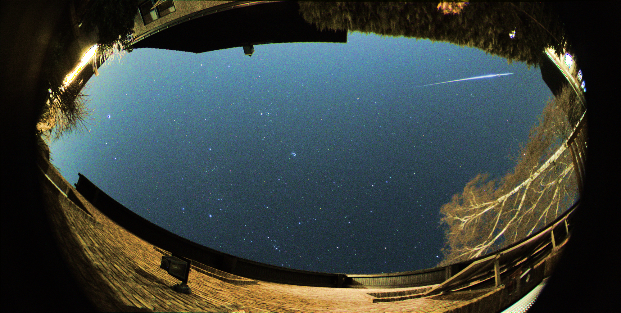 Ermutigt vom Artikel Spektrum - Astronomie-News vom 12. Dezember 2025 habe ich meine Weitwinkeloptik einen Tag nach dem Geminidenmaximum auf den Himmel gerichtet. Am Tag des Maximums selber war es die gesamte Nacht hindurch bewölkt und es gab keine Chance für eine Aufnahme. Wie man an den Rändern meiner Aufnahme unschwer erkennen kann, leuchtete die Weihnachtsillumination unerträglich hell - mein Haus wird lediglich von den Nachbarn erhellt. Die einzelne Aufnahme hat eine Belichtungszeit von fünf Sekunden. Das Bild ist eine Zusammensetzung von zwei Aufnahmen, da der Meteor genau zum Ende der einen und zum Anfang der anderen Belichtung fiel. Insgesamt habe ich neun Meteore erwischt in etwas über zwei Stunden. Die anderen Bilder muss ich allerdings erst noch bearbeiten. Das hier war das prächtigste Exemplar. Zwei weitere sehr helle waren noch dabei, der Rest war durchschnittlich. Für meinen relativ kleinen verfügbaren Himmelsasuschnitt ganz ordentlich, ich denke insgesamt war es noch eine gute Nachlese, ziehe ich den gesamten Bereich des Himmels in Betracht.
