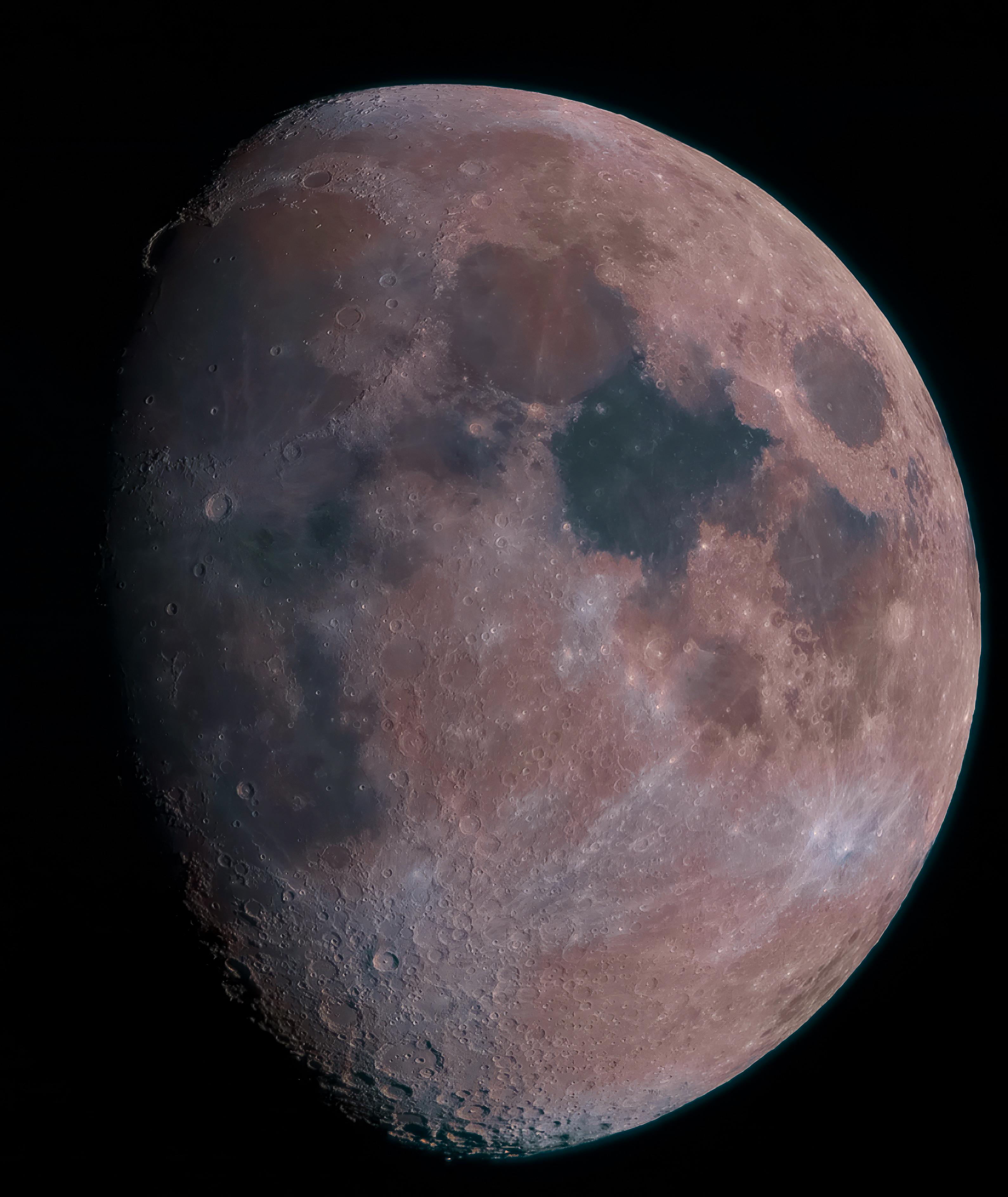 Den Mond kennen wir in der Regel nur als grauen Erdtrabanten. Doch durch die starke Anhebung der Farbsättigung in der Fotobearbeitung können farbliche Bereiche sichtbar gemacht werden, die Rückschlüsse auf die mineralische Zusammensetzung der Mondoberfläche erlauben.