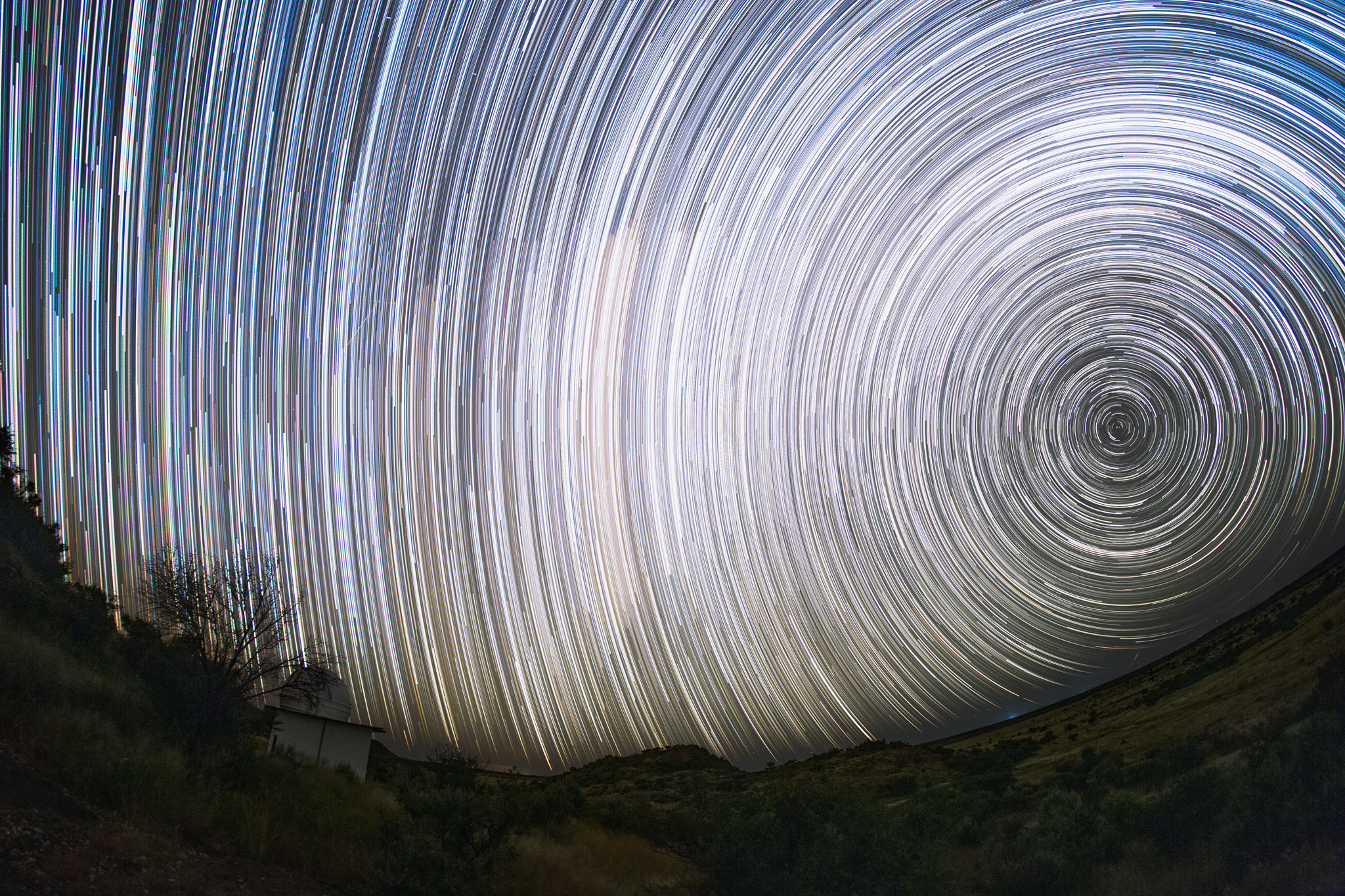 Trotz mäßiger Transparenz und horizontnahem Dunst ist die Anzahl der Sterne unter einem dunkeln Himmel immer noch überwältigend und das ganze Bild ist nahezu komplett überzogen mit Sternstrichen.