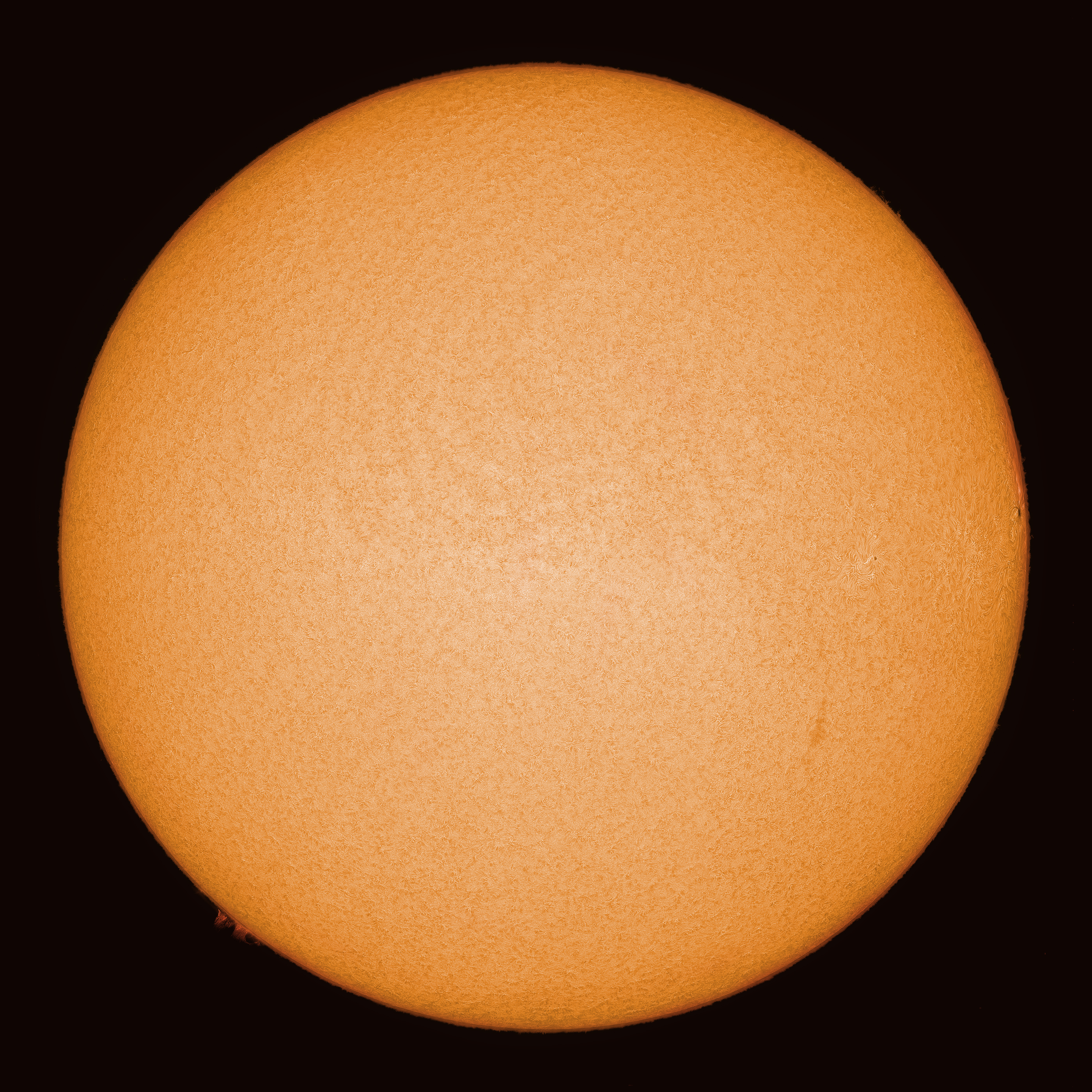 Am Karfreitag nahm ich dieses hochauflösende Bilder der Sonne im H-Alpha-Licht auf. Die Gesamtaufnahme besteht aus zwölf Einzelbildern. Zu erkennen sind zwei Sonnenfleckenregionen (AR 2738 und AR 2739) und diverse Protuberanzen am Sonnenrand. Das Bild wurde koloriert, um den Eindruck des sichtbaren Lichts zu simulieren.