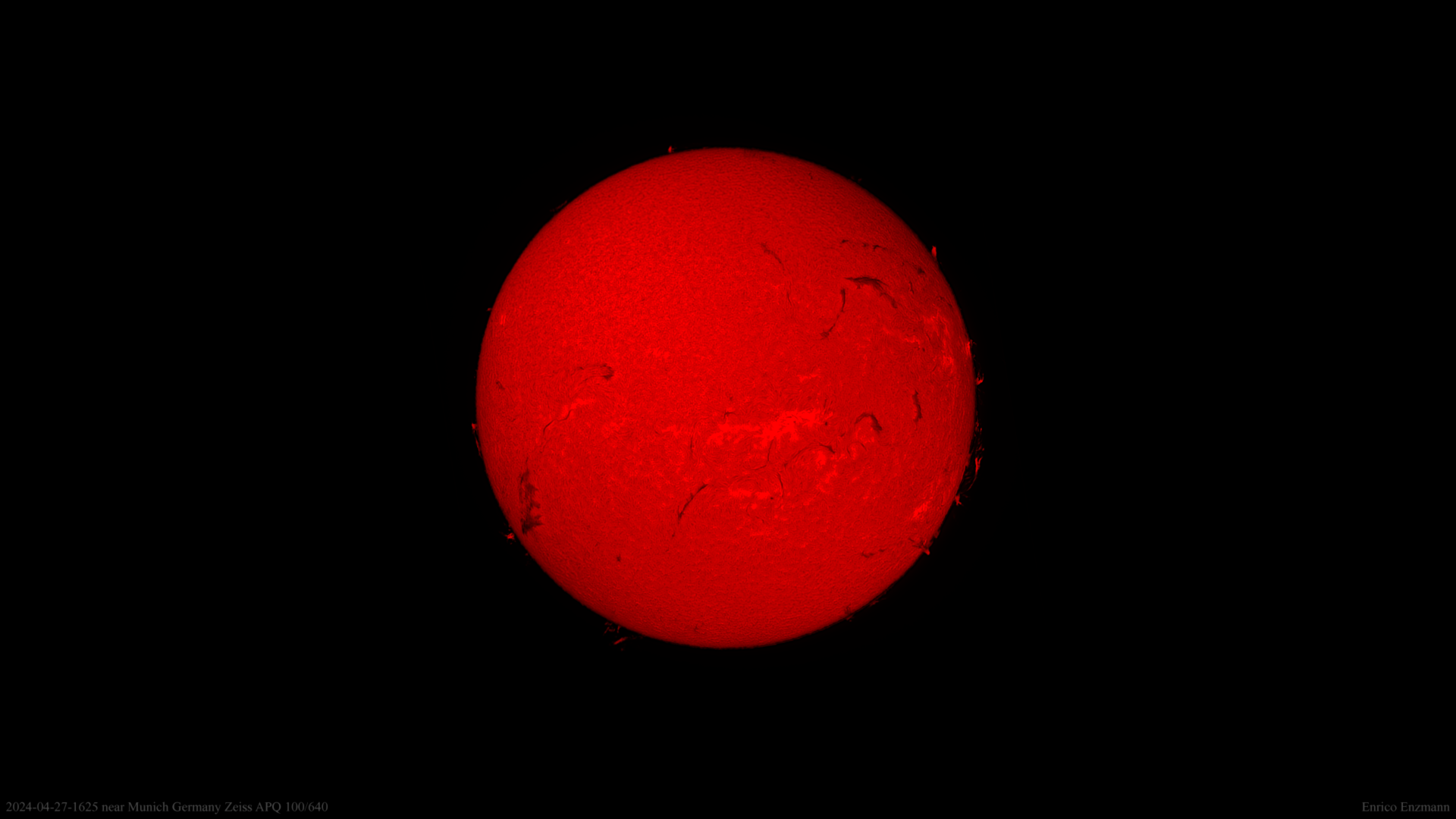 Aufgrund der hohen Brennweite meiner Teleskope wollte ich schon länger die Gesamtsonne in H-alpha aufnehmen. Nun konnte ich das endlich machen, da das kleine Sonnenteleskop heute montiert wurde. Dies hatte länger als gedacht gedauert, und die Sonne war zum Zeitpunkt der Aufnahme nur noch etwa 26 Grad über Horizont. Das H-alpha-System besteht aus einem Doublestack Etalon der Firma Solarscope die in einem von mir entworfenen System mit speziellen Filtern und Blenden so verbaut sind, das wenn die Komponenten alle in der richtigen Temperatur sind, visuell bereits ein sehr hoher Kontrast zu sehen ist.