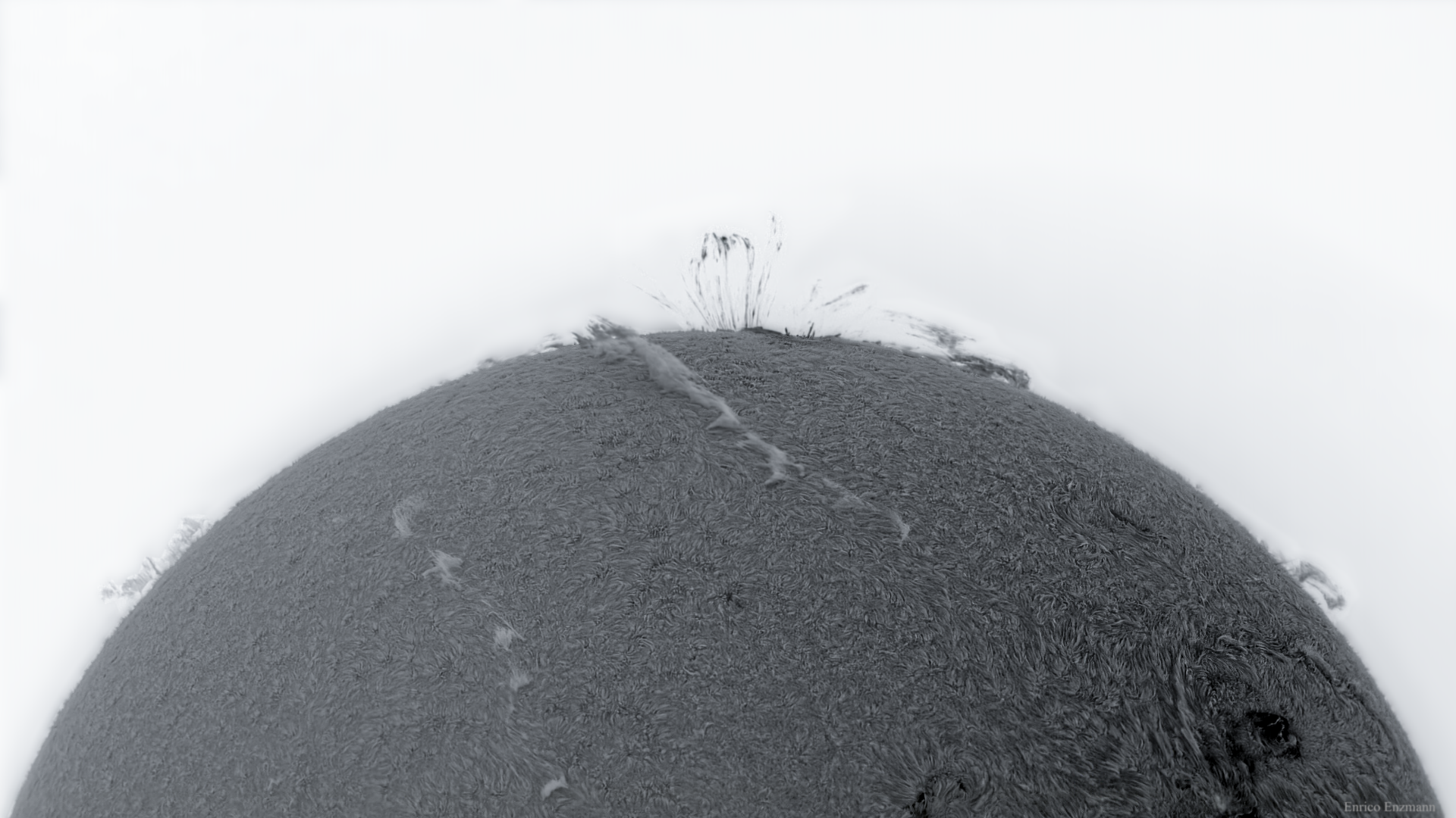 Erstmalig habe ich mal ein Negativbild der Sonne in H-alpha gemacht. Hierzu wurde nach dem normalen Processing schlicht eine Photoshop-Funktion genutzt, die das Bild entsprechend umwandelt.