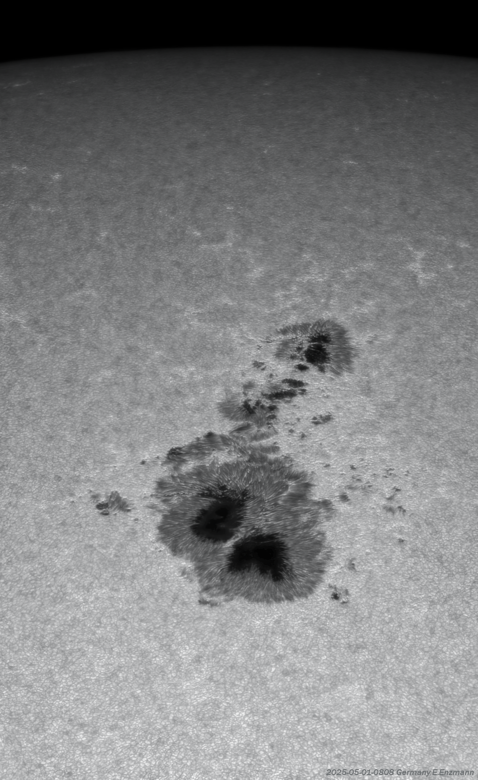Der vor einigen Tagen aufgetauchte riesige Fleck wandert weiter in die Mitte der Sonne. Wenn er die Größe beibehält, wäre das schön, da Aufnahmen am Rand weniger Details zeigen. 335 mm off axis Baader Herschel modifiziert mit aktiver Kühlung und neuer Solar Continuum mit 7.5nm Halbwertsbreite. 60 Sek. Video 100 besten Bilder gestäckt und mit RegiStax und PS bearbeitet.