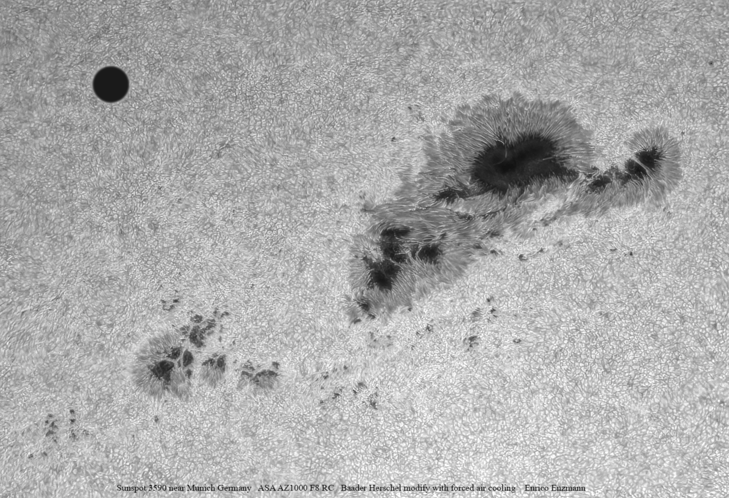Selten sind solch große Sonnenfleckengruppen sichtbar. Die Gruppe AR 3590 hat eine gigantische Ausdehnung: Sie ist etwa 17-mal so groß wie die Erde. Um das besser deutlich zu machen, habe ich in die Aufnahme vom 25.02.2024 links oben die Erde im richtigen Maßstab in das Bild eingefügt. Dies gibt eine bessere Vorstellung davon, wie riesig diese Fleckengruppe ist. Die Sonne stand zum Zeitpunkt der Aufnahme nur 32 Grad über Horizont. Das ist nicht viel, um feine Strukturen aufzunehmen. Gerade mit größeren Öffnungen muss das Seeing dann schon recht gut sein, und das war es erstaunlicherweise auch.