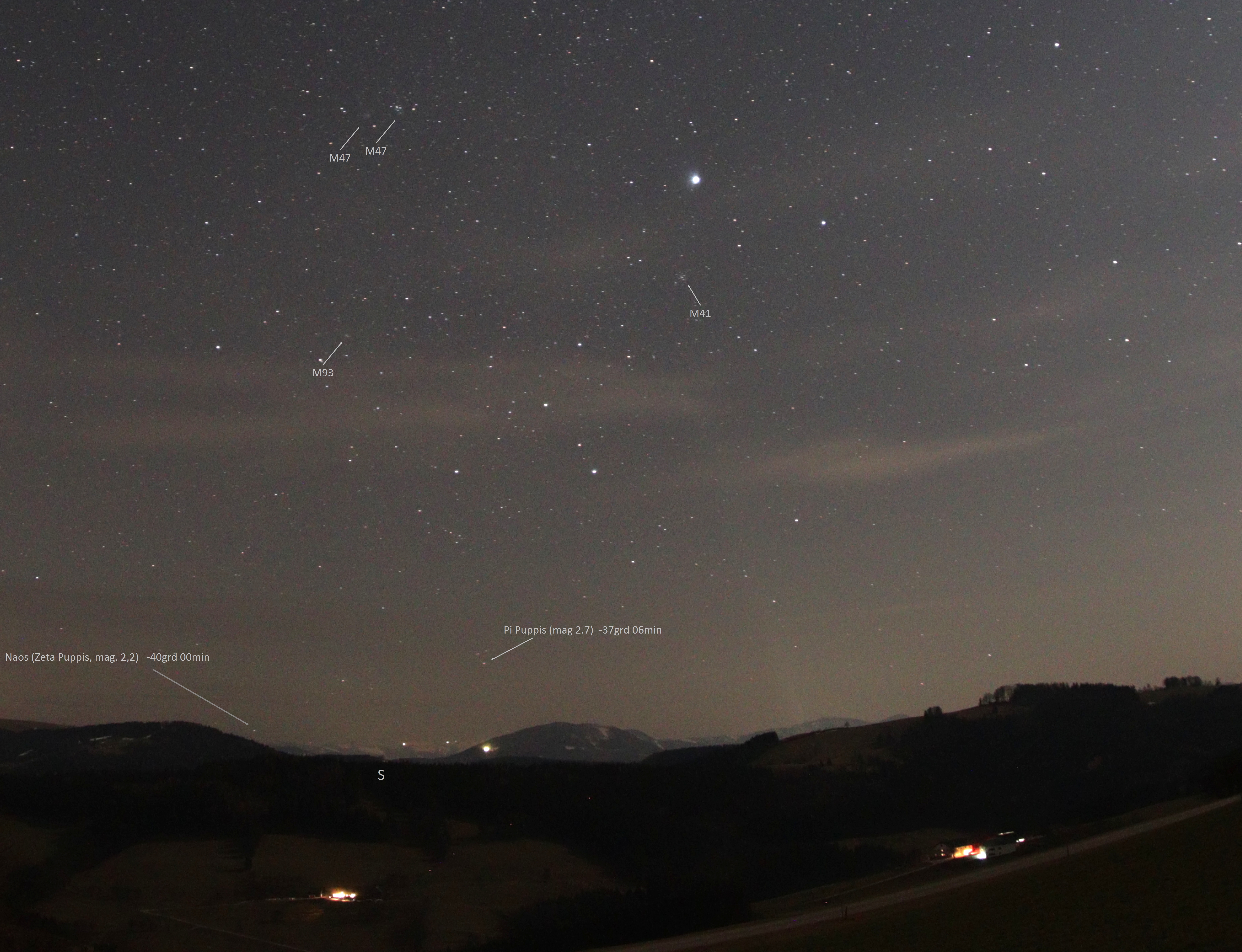 Hier eine Ausschnittvergrößerung mit Südhorizont, wo NAOS gerade hinter fernen Bergen erscheint, aber viel schwächer als der Stern Pi Puppis. Es zeigt sich auf den Aufnahmen, dass hier eine dünne Wolkenschicht am Horizont lag. Im Feldstecher 8x24 war der Stern auch nur schwach zu sehen. Ungefähr 20 Minuten lang konnte ich nun den Stern von Ost nach West ziehen sehen, bis er hinter der nächsten Bergkuppe verschwand. Zunehmend waren von Norden her immer kompaktere Wolken aufgezogen mit Richtung nach Süden, so dass nach dem Verschwinden von NAOS der Himmel vollkommen zu war. Glück gehabt!